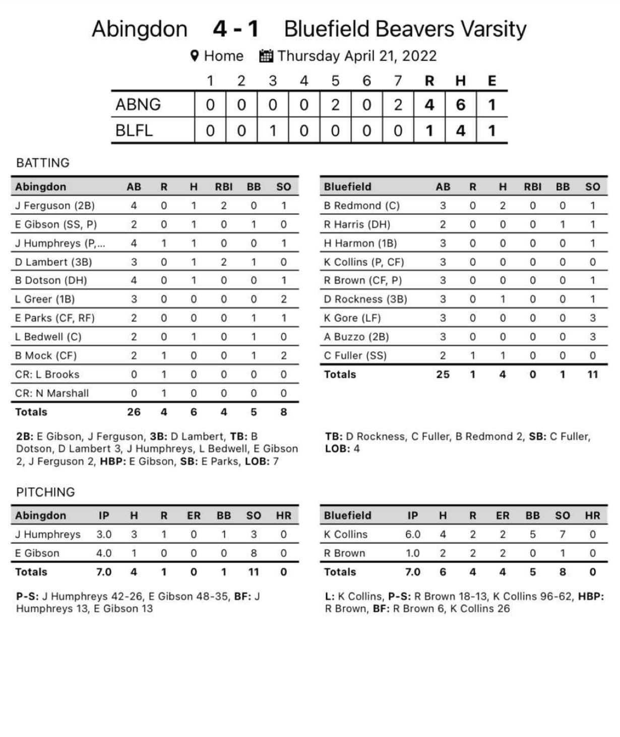 Bluefield – Blueifled was limited to just four hits Thursday, falling 4-1 to Abingdon, Va. at Bowen Field. Bryson Redmond led the Beavers with two hits in the loss.