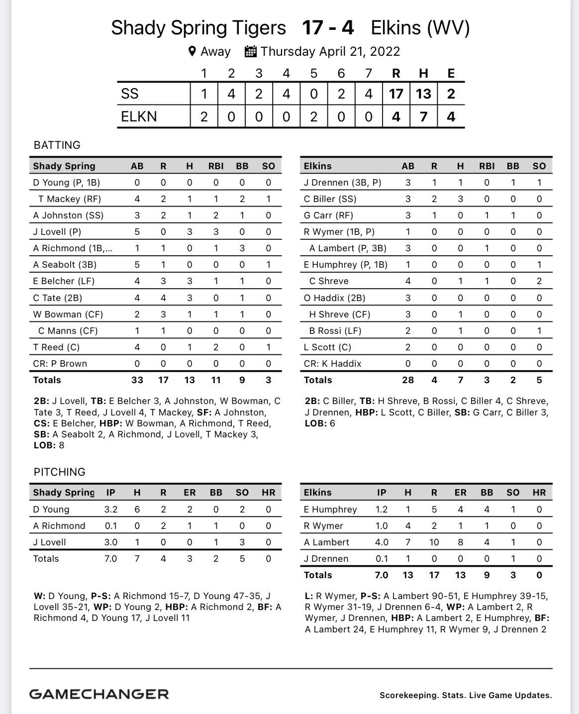 Elkins – Josh Lovell, Evan Belcher and Colten Tate each collected three hits as Shady Spring defeated Elkins 17-4 on the road Thursday evening.
