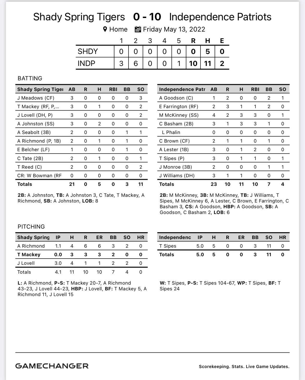 “We had first and second in the second inning down 3-0 and we try to execute a bunt and didn’t make it happen,” Shady head coach Jordan Meadows said. “We had three strikeouts after that and they’re a good team. (Independence pitcher Tanner Sipes) shut us down two years in a row. We live to see tomorrow though.”