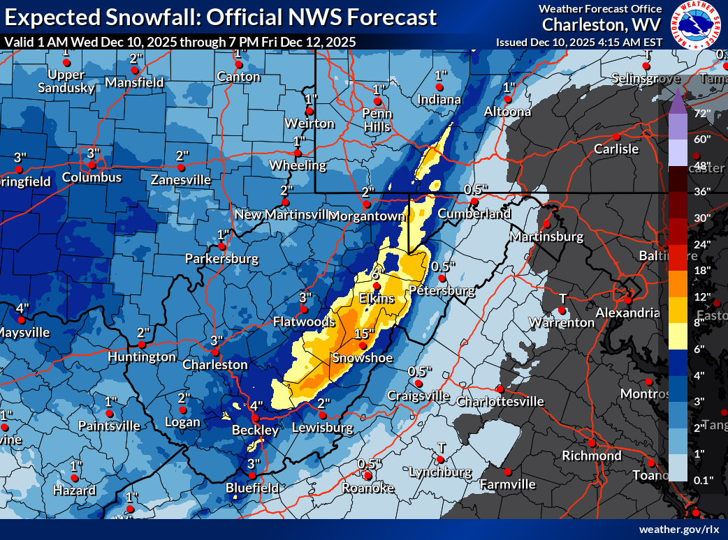 A Blizzard Warning remains in effect from 10 a.m. Wednesday through 10 a.m. Thursday for Northwest Pocahontas, Southeast Randolph, and Southeast Webster counties, including the communities of Harman and Snowshoe. The Weather Service expects 4 to 8 inches of snow, with isolated higher totals possible. Wind gusts may reach 45 mph, creating whiteout conditions.