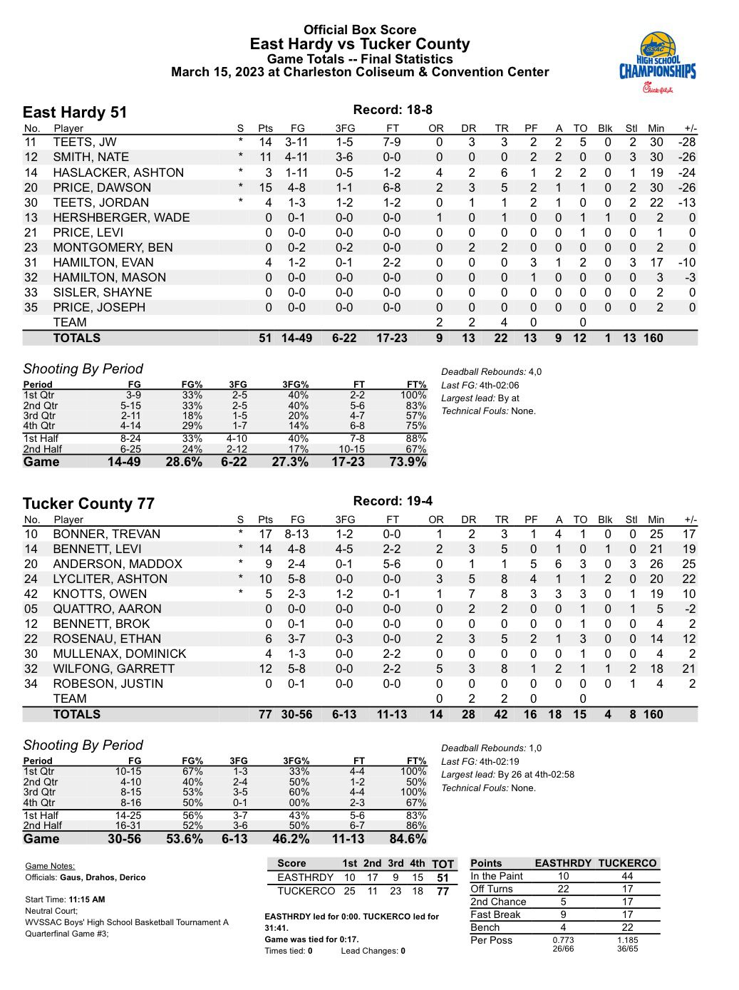Charleston – East Hardy managed to convert on just 28 percent of its field goal attempts Wednesday morning, falling 77-51 to Tucker County in the Class A quarterfinals at the Charleston Coliseum and Convention Center.