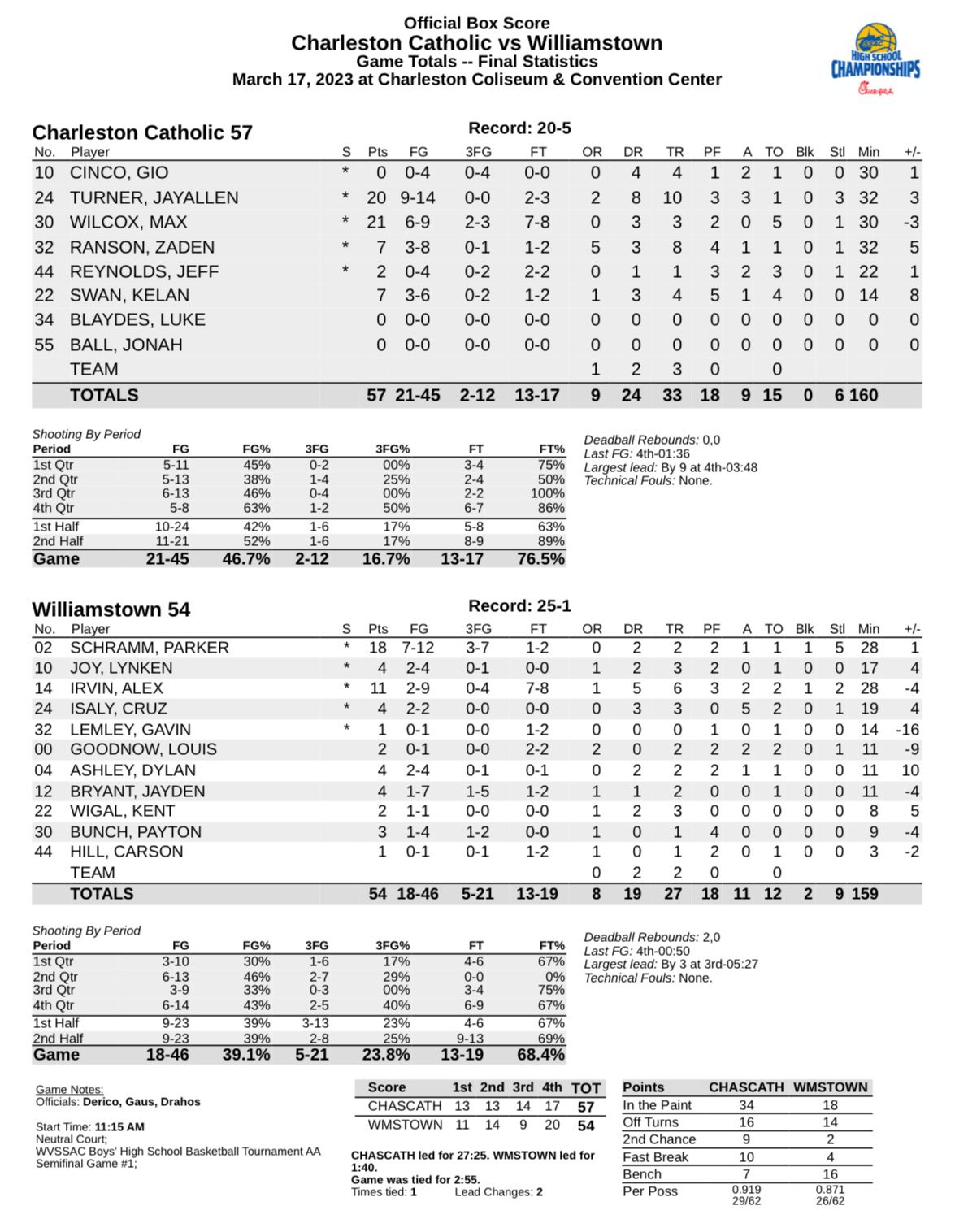 Charleston – Charleston Catholic shot 46 percent from the field and limited No. 1 Williamstown to 5 of 21 shooting from beyond the arc in a 57-54 upset of the Yellowjackets Friday afternoon in the Charleston Coliseum and Convention Center.