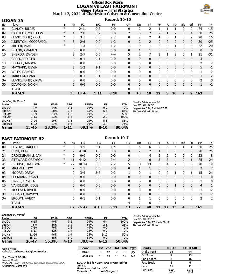 Charleston – Class AAA No. 4 East Fairmont led by nine points at the break and outscored No. 5 seed Logan 33-15 in the second half en route to a 62-35 win.