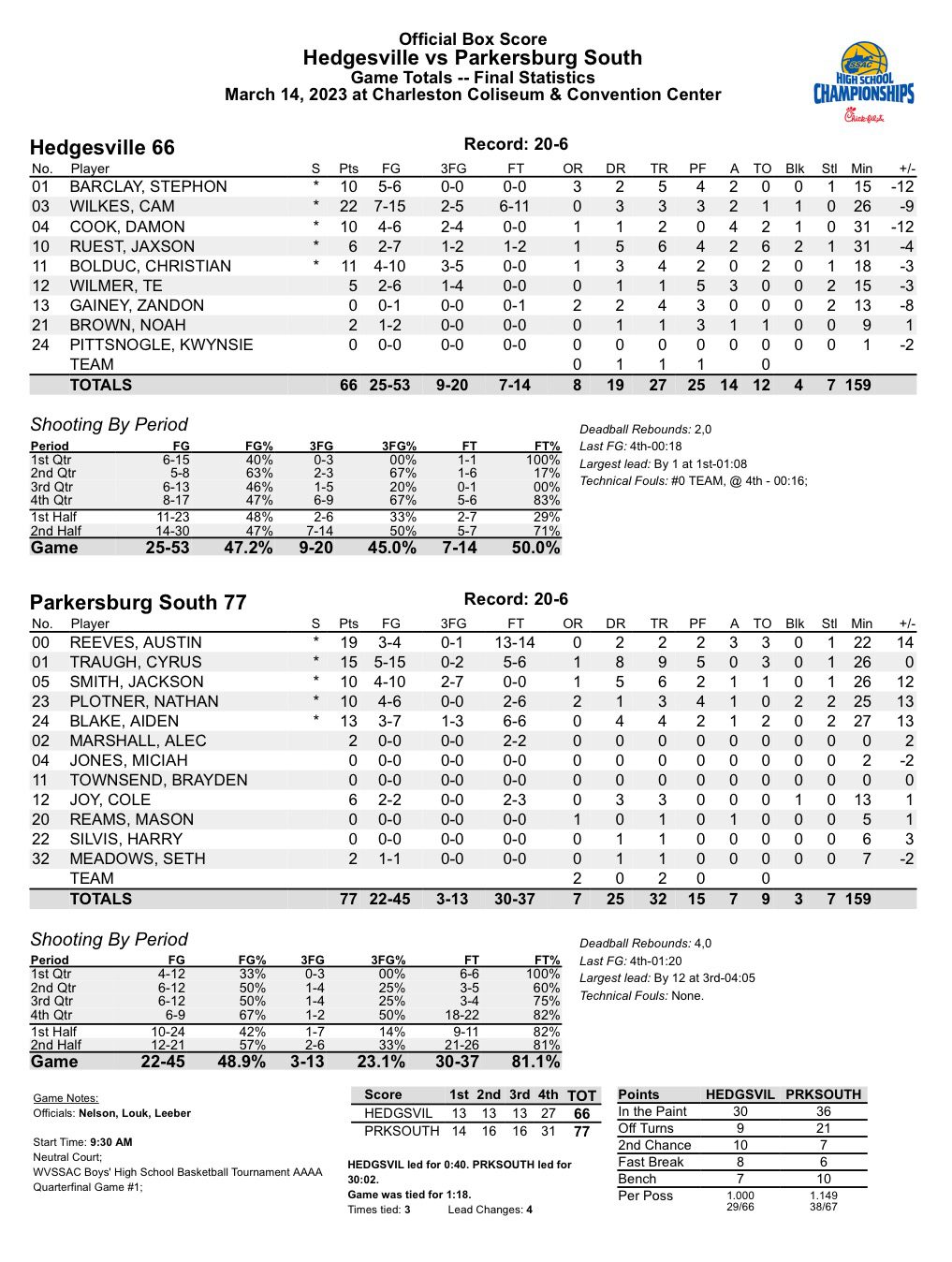 Charleston – Parkersburg South placed its entire starting five in double figures Tuesday morning as the Patriots opened the state tournament with a 77-66 win over Hedgesville in the Charleston Coliseum and Convention Center.