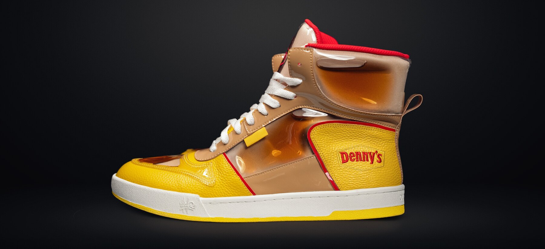 The over-the-top footwear was created in collaboration with celebrity sneaker designer Mache, known for his bold custom designs. Denny’s says the syrup-filled high-tops celebrate the “golden drip” that makes their Grand Slam® breakfasts famous.