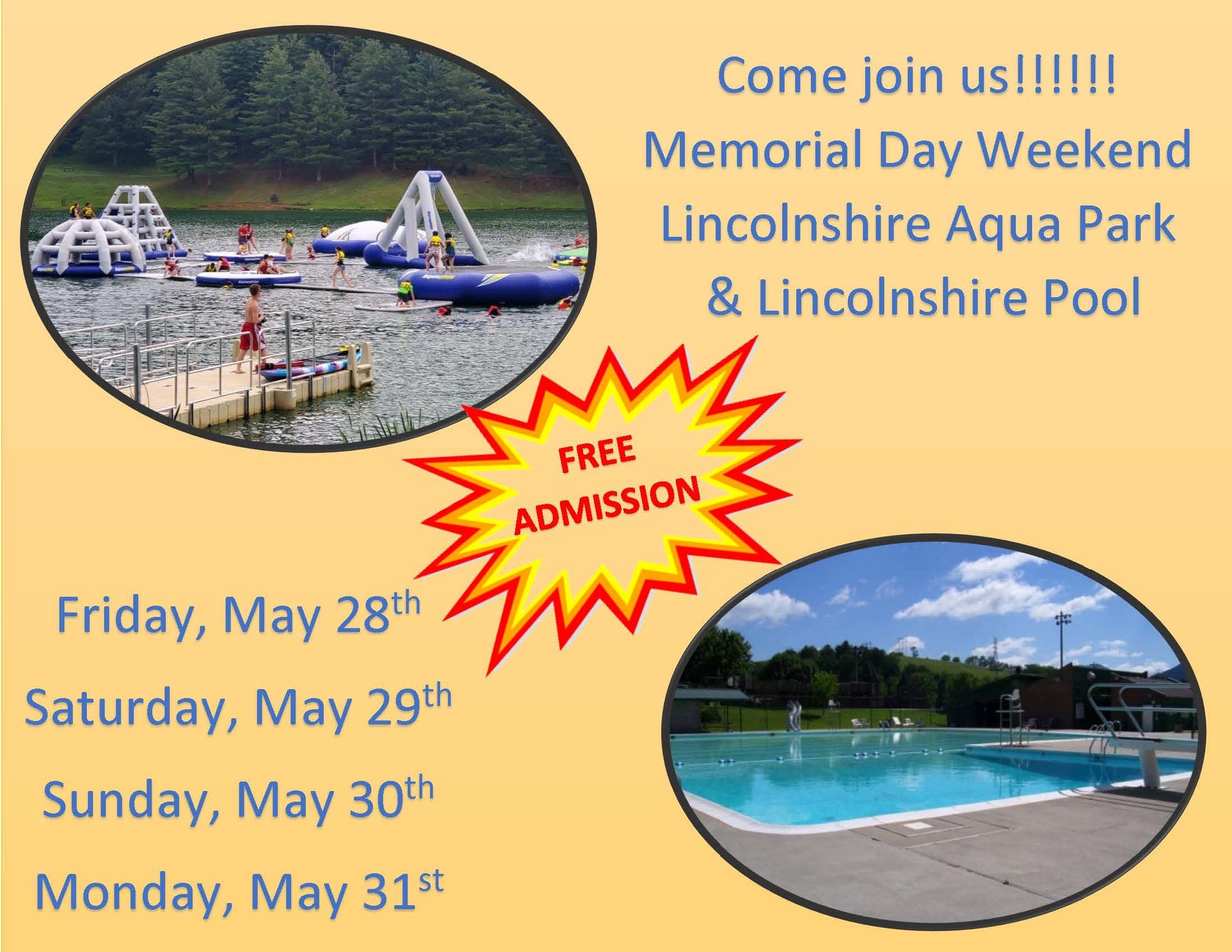 TAZEWELL, VA (LOOTPRESS)– Lincolnshire Aqua Park and Lincolnshire Pool are giving free admission on Memorial Day Weekend.