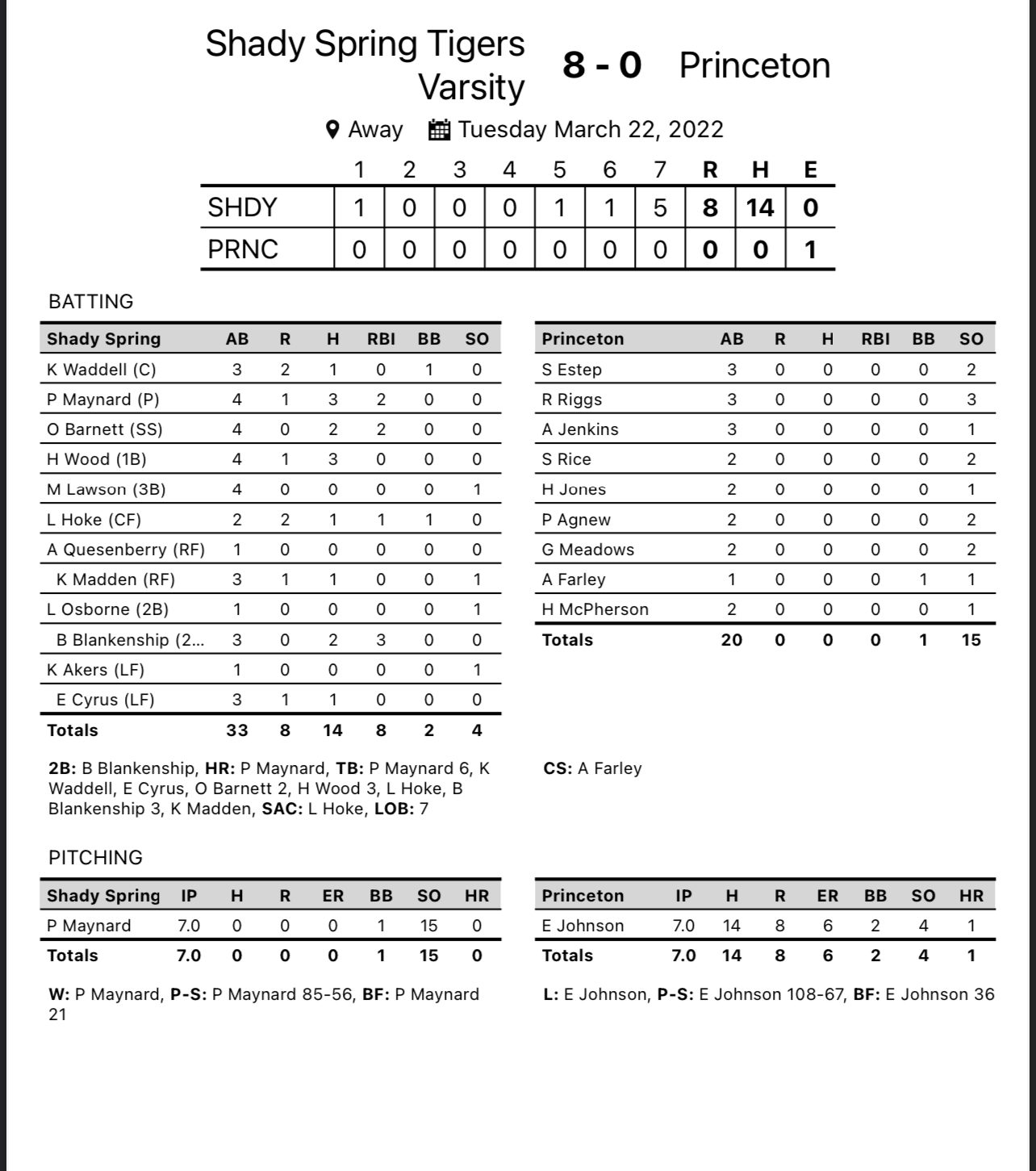 Princeton – Paige Maynard did it all Tuesday evening, going 3 for 4 at the plate with a home run and pitching a complete-game shutout as Shady Spring picked up an 8-0 victory at Princeton.