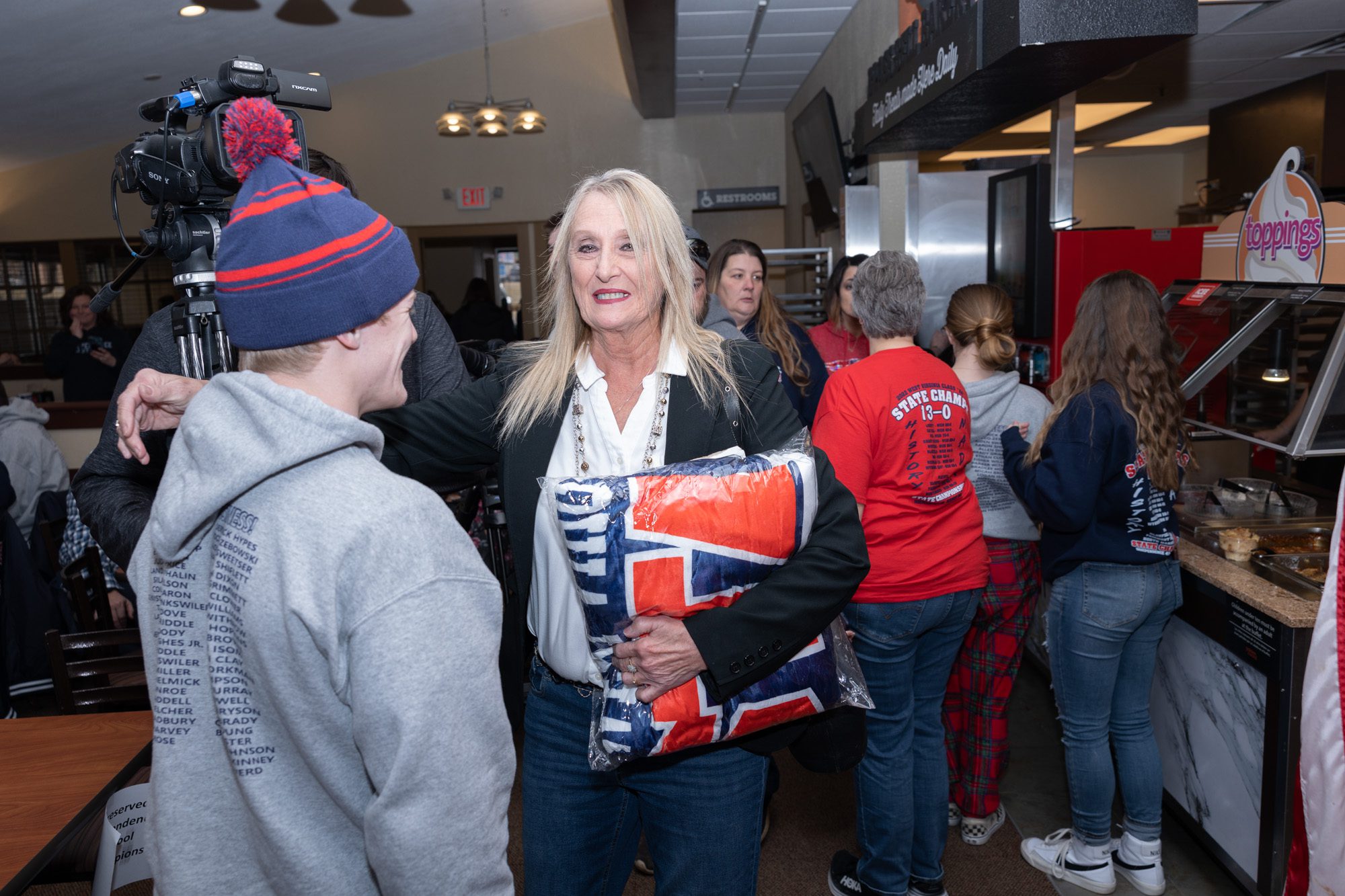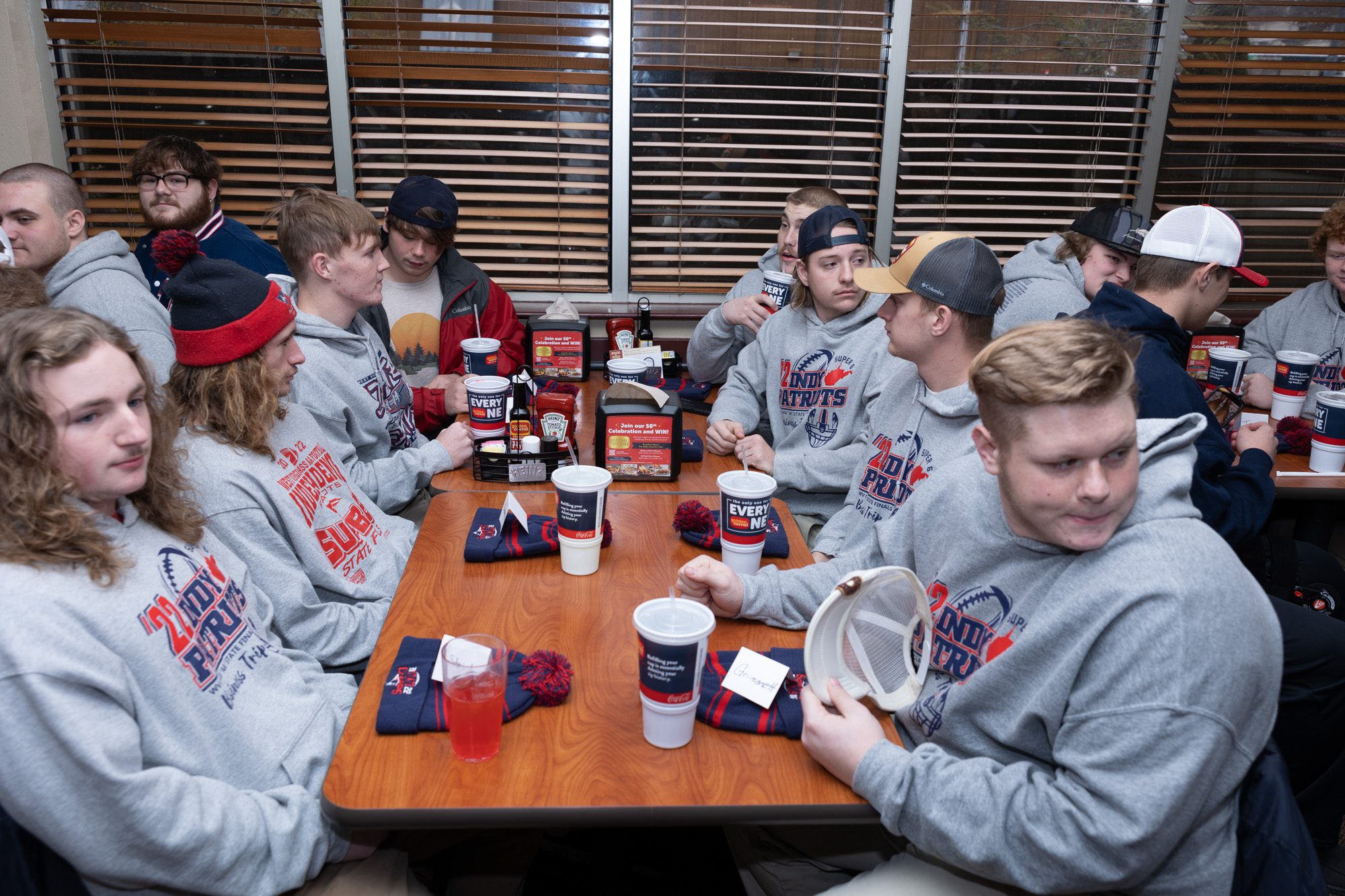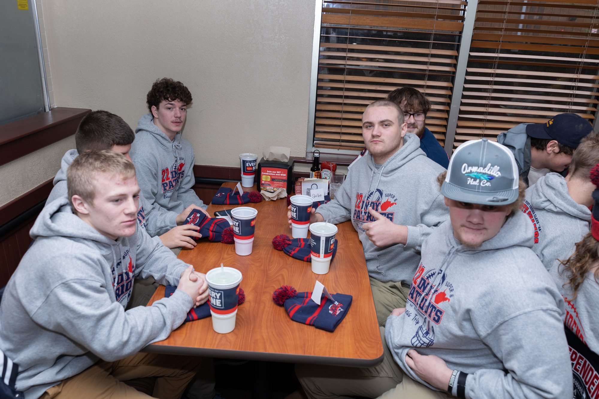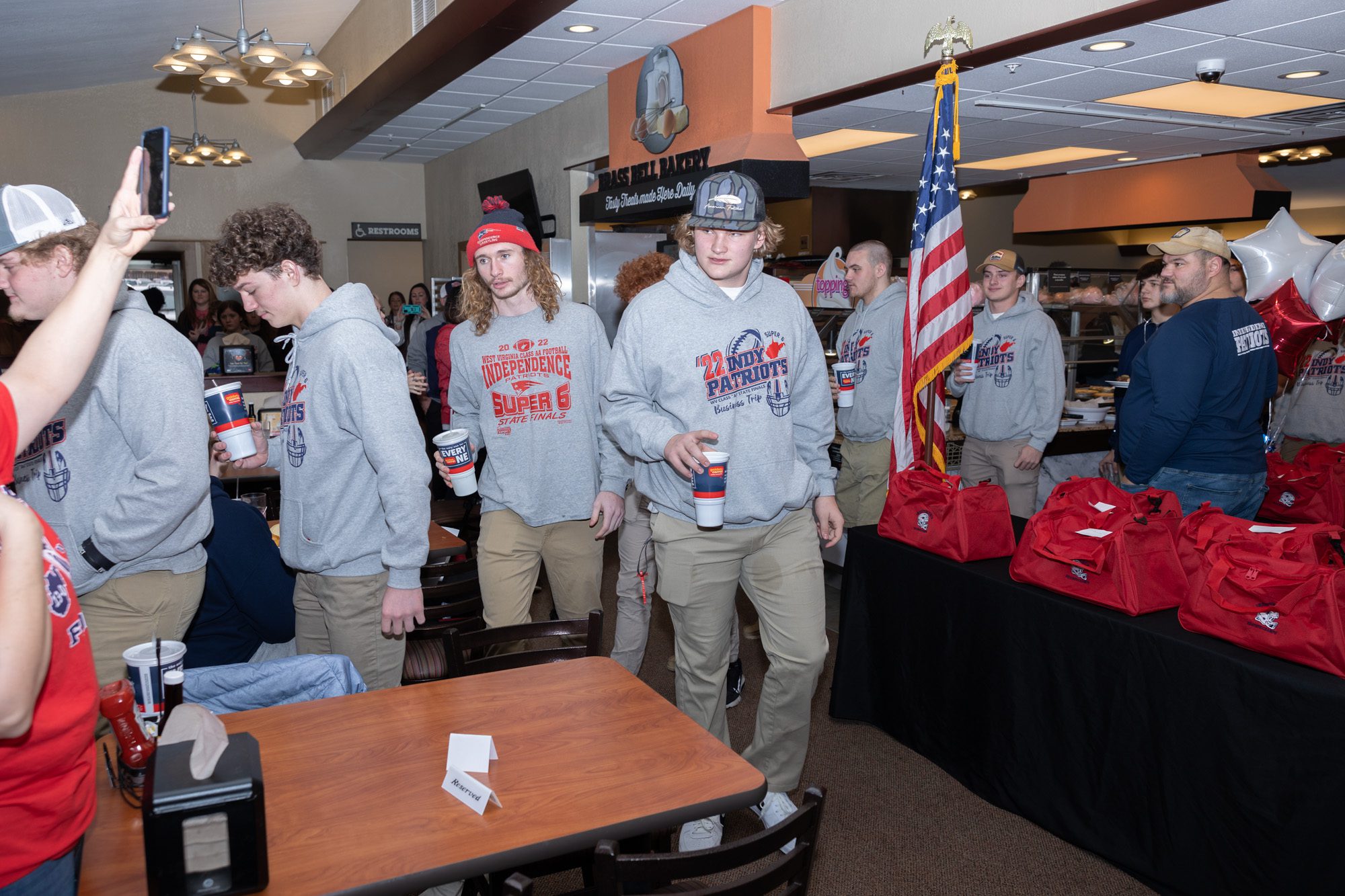 The Patriots received state championship gear such as jackets, bags and beanies commemorating their historic feat.