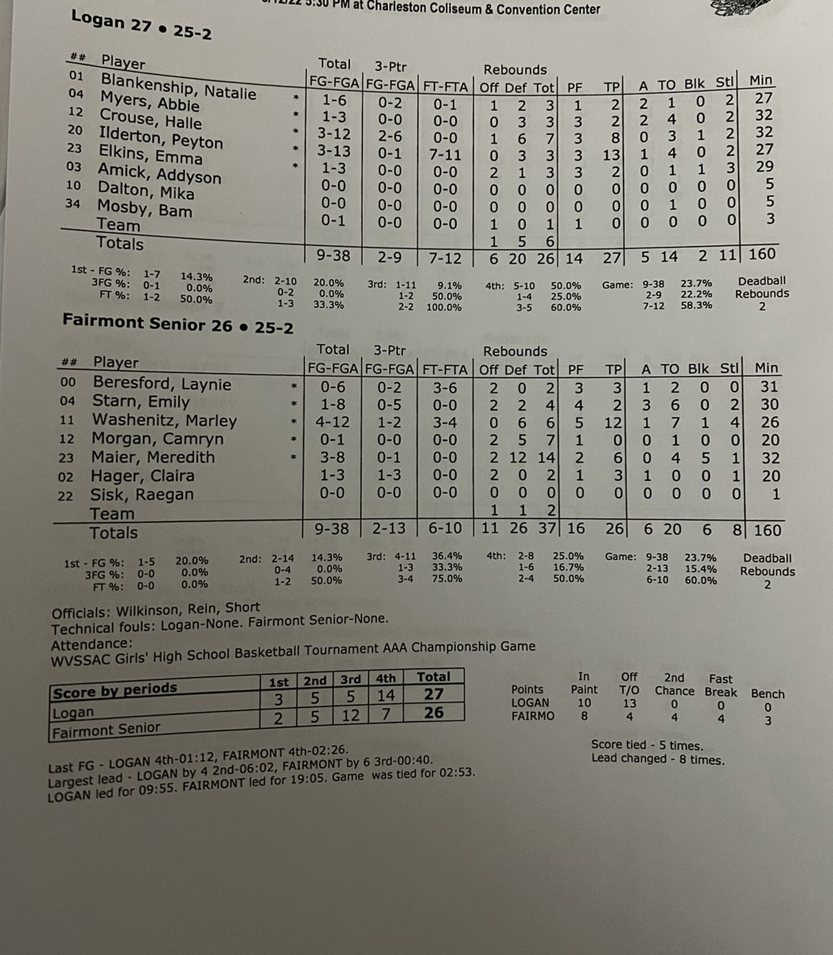 In a defensive battle where both teams shot 23 percent from the field on 38 field goal attempts each, Logan made just enough stops and converted on its chances late to defeat No. 1 Fairmont Senior 27-26 In the Class AAA state championship game.