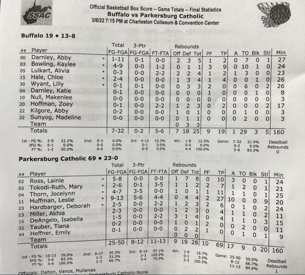 Flanking Huffman, Jocelynn Horn (11) and Lainie Ross (10) each scored in double figures. Kaylee Bowling led Buffalo with nine points int he loss.