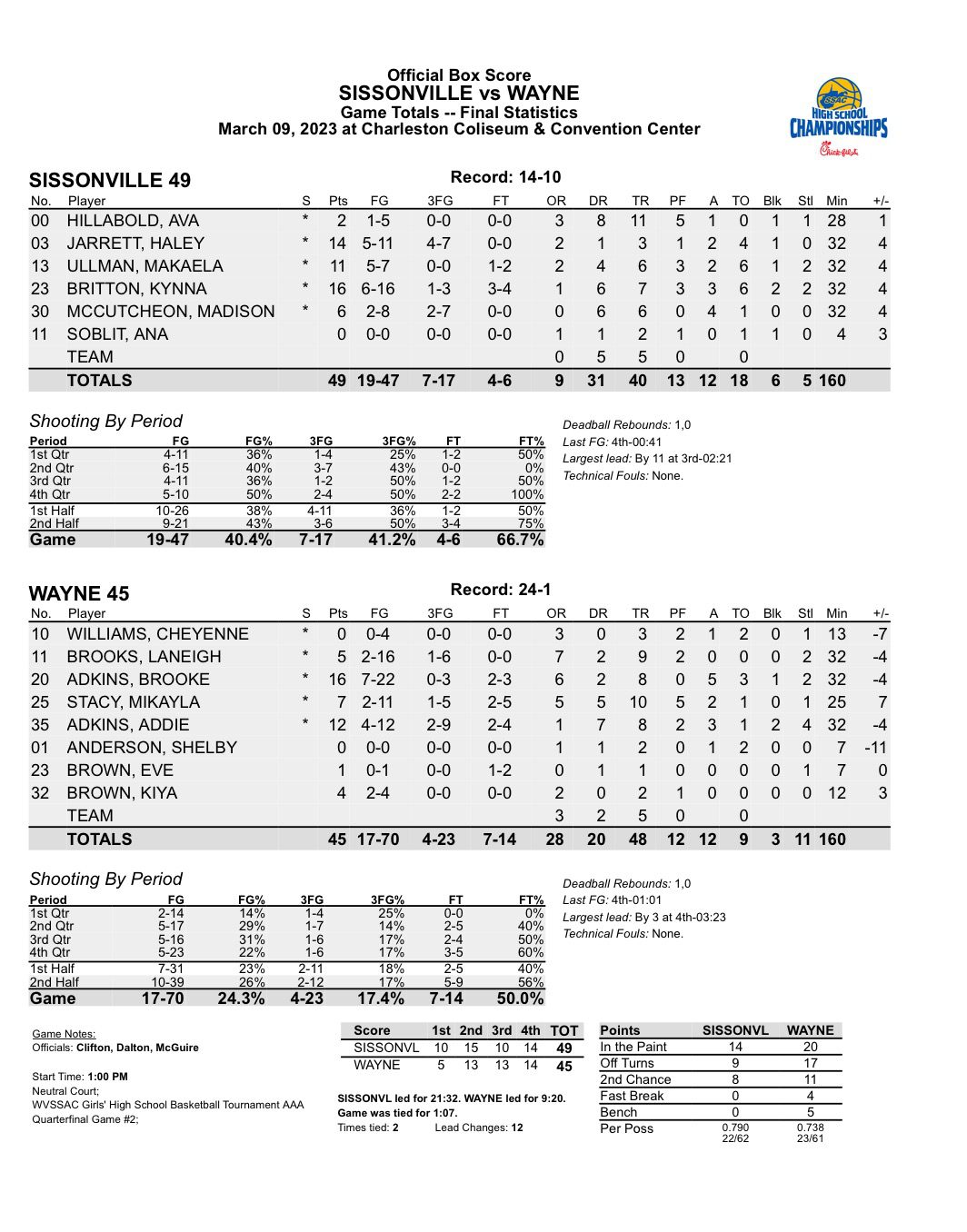 Charleston – Haley Jarrett’s 3-pointer with 41 seconds left gave No. 7 Sissonville a 47-45 lead, one it didn’t relinquish in upsetting No. 2 Wayne 49-45 Thursday afternoon in the Class AAA quarterfinals at the Charleston Coliseum and Convention Center.