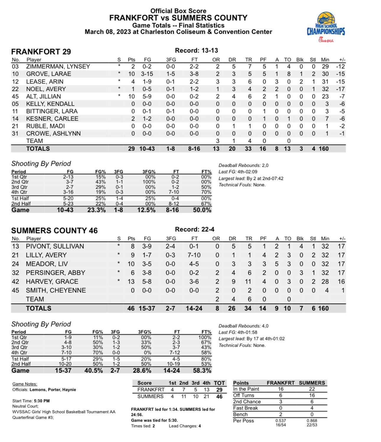 Persinger’s layups before the half gave Summers a 15-11 advantage but the drought to start the third gave Frankfort an opportunity to climb out of the hole and take a 16-15 advantage on a Carlee Kesner layup.
