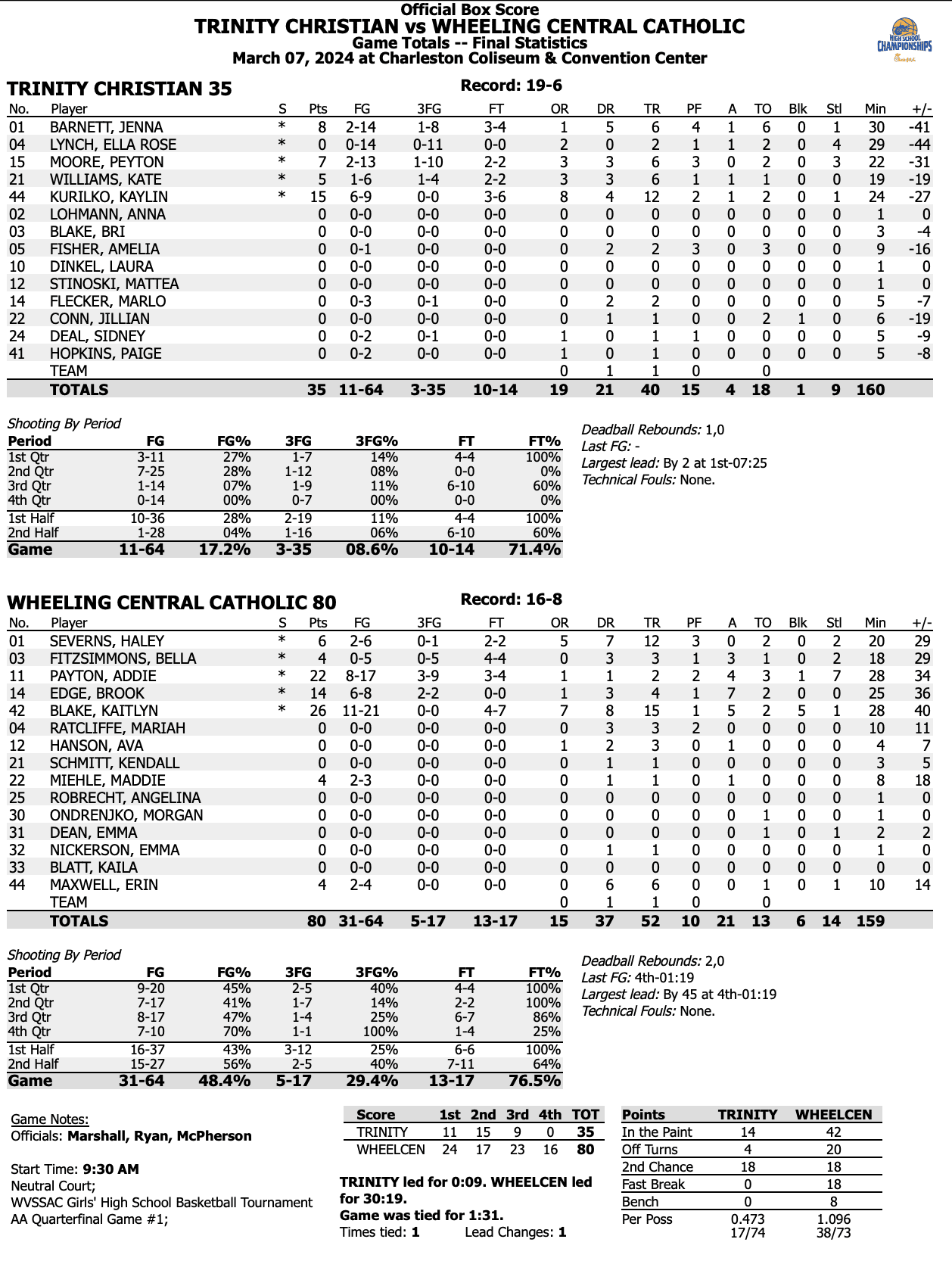 Charleston – No. 6 Trinity went 1 of 28 from the floor in the second half, falling 80-35 against against No. 3 Wheeling Central in the Class AA quarterfinals Thursday morning in the Charleston Coliseum and Convention Center.