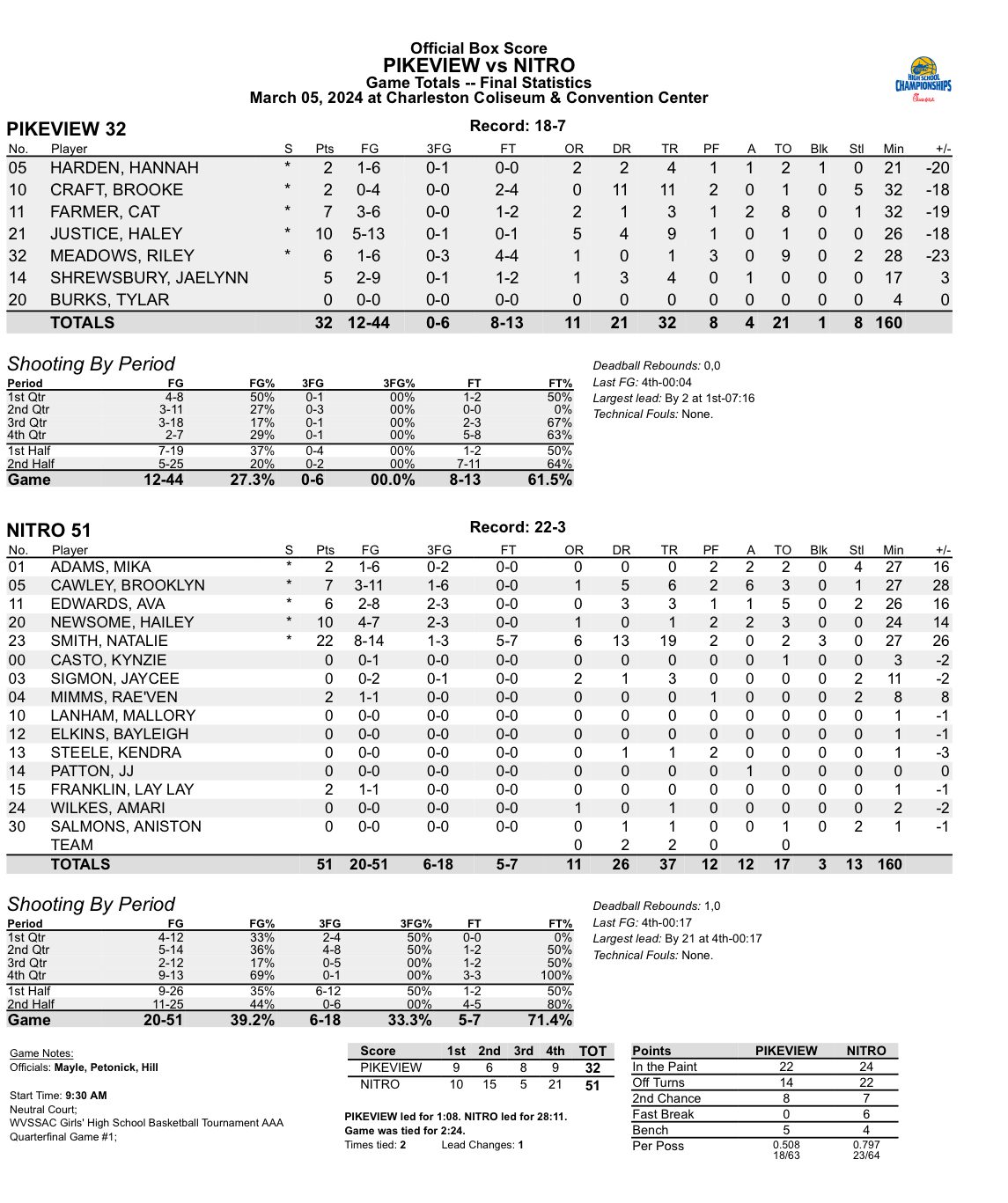 “Just looking quickly here at the stats it looks like we shot 27 percent for the game and when you get to this level, that’s not going to get it done,” PikeView head coach Tracy Raban said. “Give credit to Nitro’s defense. I mean, we knew they were going to pressure us and knew Cat (Farmer) was going to have a tough morning. But I felt for the most part she did all she could do but 27 percent is not gonna get it done and with 21 turnovers on top of that, to me, that’s the ballgame. That’s the difference in the game.”
