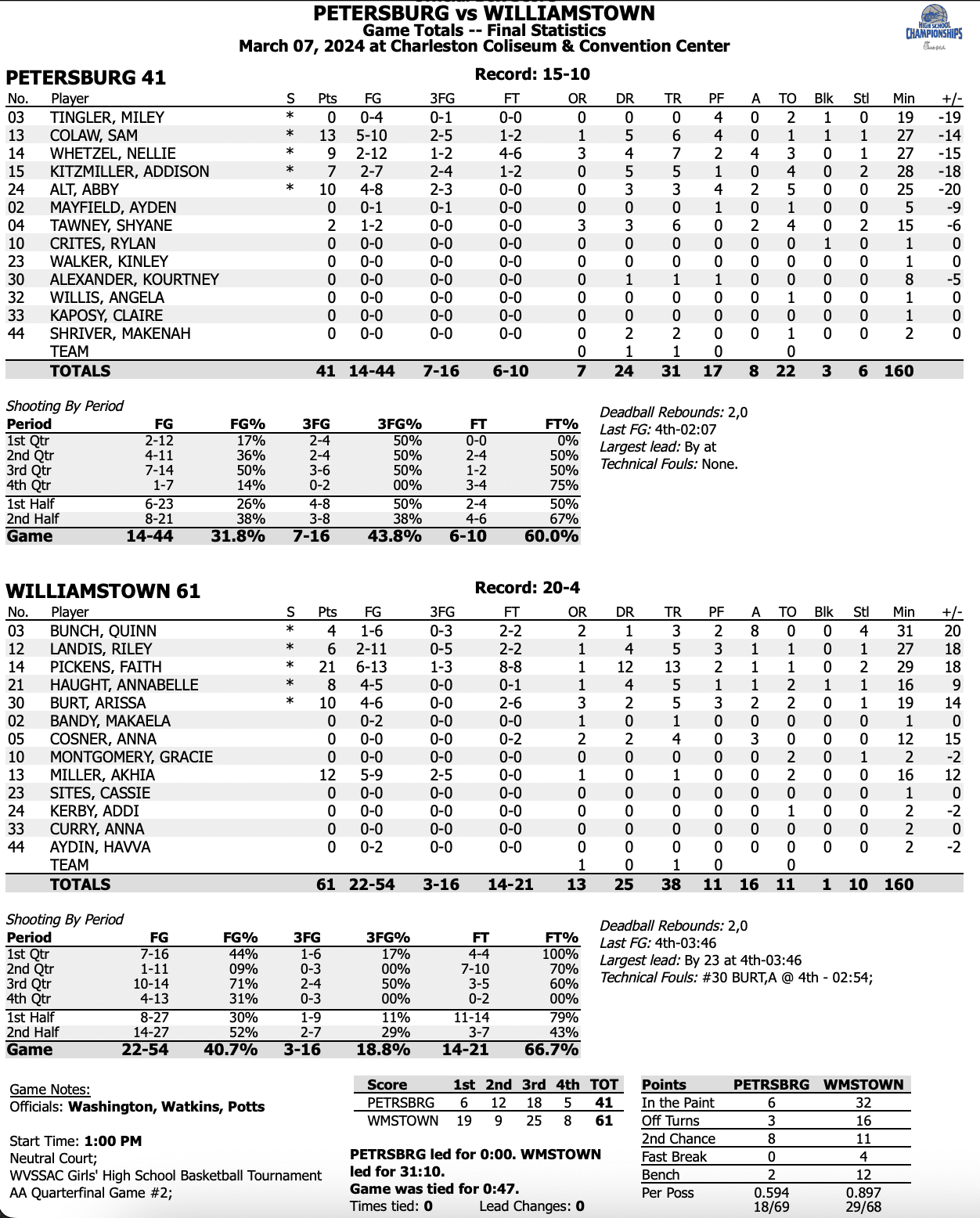 Charleston – No. 2 Williamstown used a 25-point third quarter to pull away from No. 7 Petersburg Thursday afternoon in the Charleston Coliseum and Convention Center.