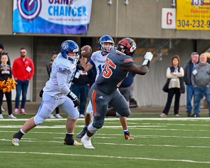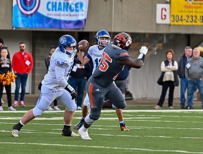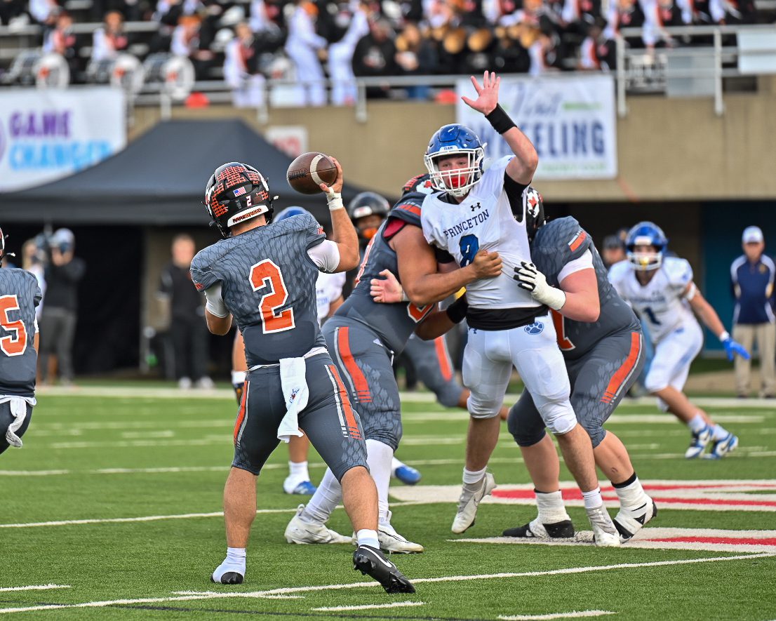 Wheeling – Martinsburg leads Princeton 28-13 at halftime of the Class AAA title game. Princeton scored first and last in the half with Dom Collins hauling in touchdown passes of 44 and 51 yards.