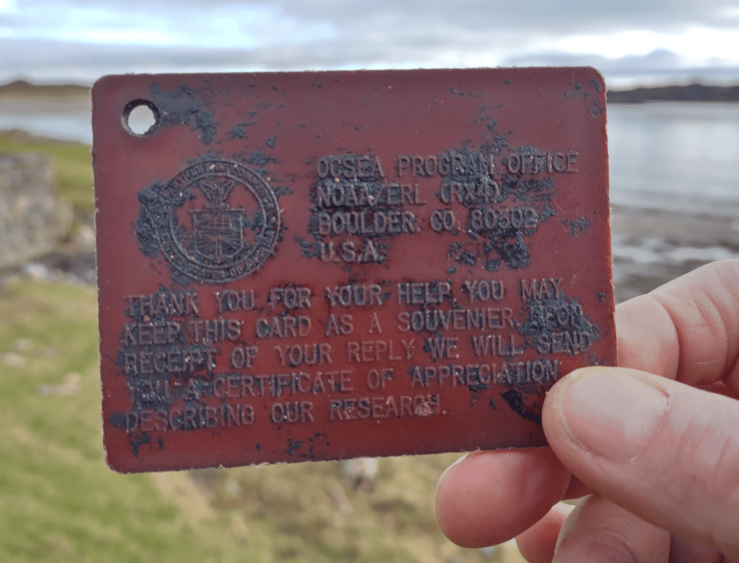 Isle of Coll, Scotland (LOOTPRESS) – Barbara Payne, a longtime resident of the Isle of Coll off Scotland’s coast, made a remarkable discovery while cleaning debris left by a storm. Amid the seaweed and plastic litter, Payne found a small, red, credit card-sized piece of plastic with instructions in English, French, and Spanish to report its find to NOAA (National Oceanic and Atmospheric Administration) in Boulder, Colorado.