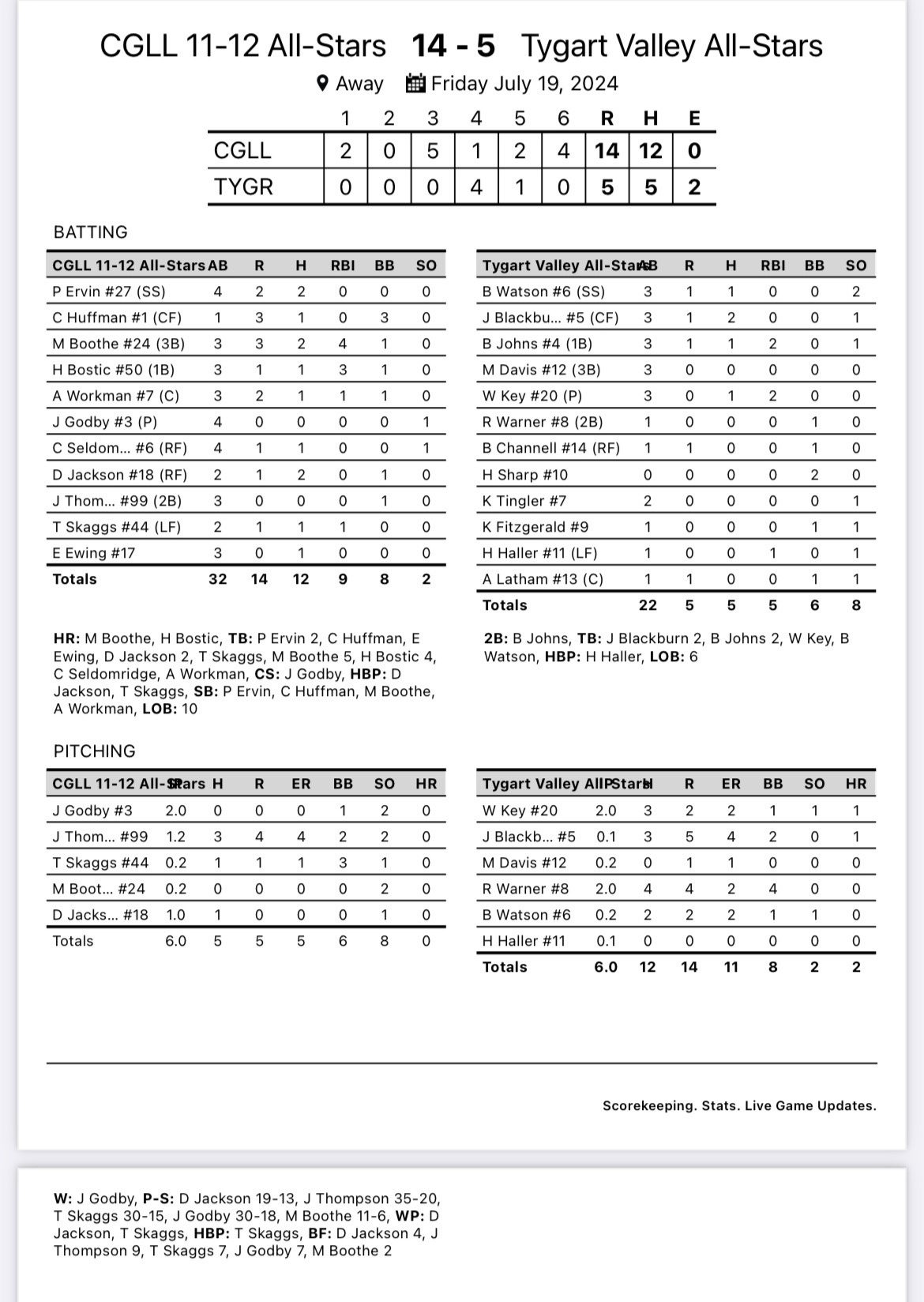 Boothe tallied four RBI and Bostic drove in three runs. Trenton Skaggs and Acen Workman also had an RBI.