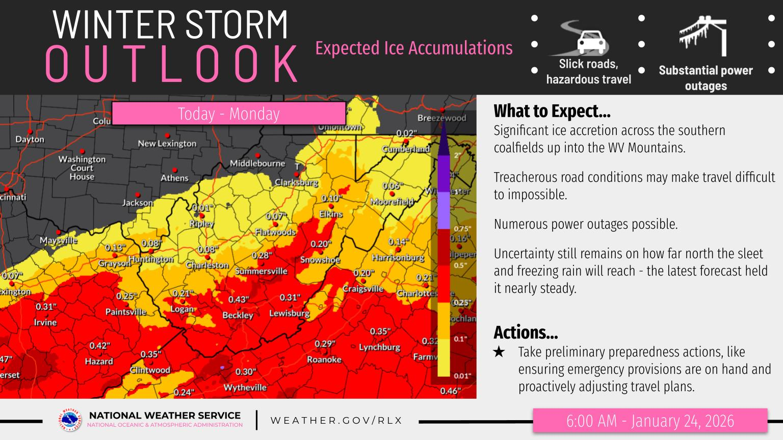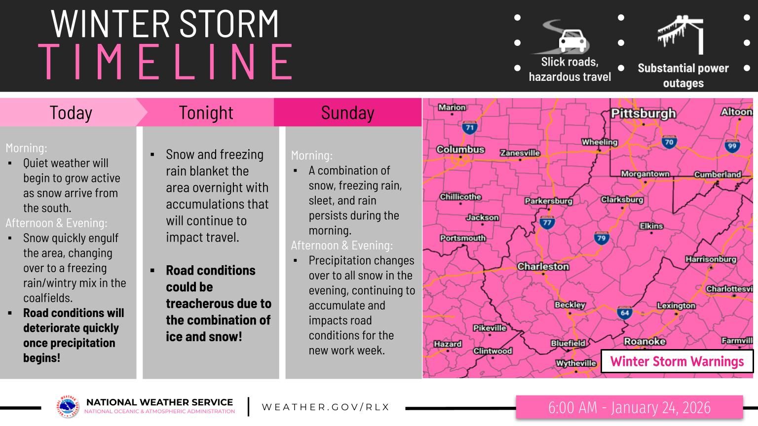 Forecasters say precipitation will spread across the area by this evening and continue through Monday, bringing a prolonged mix of snow, sleet, and freezing rain. Snowfall totals are expected to vary widely by location. Parts of the southern coalfields may see only a few inches of snow as sleet and freezing rain limit accumulation, while the northern West Virginia mountains and portions of southeast Ohio could receive up to a foot of snow where precipitation remains mostly snow throughout the event.