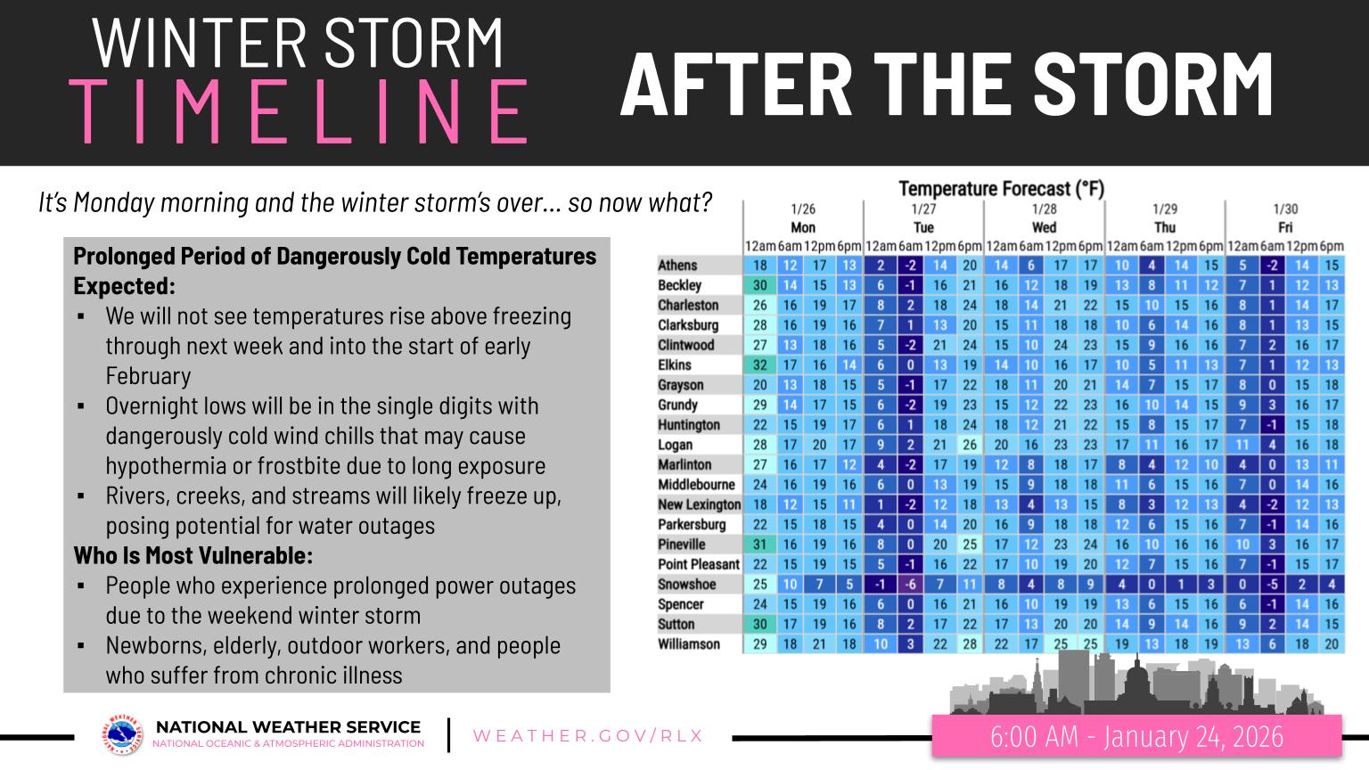 After the storm system moves offshore Monday, the danger will not be over. Arctic air is expected to pour into the region, bringing well-below-normal temperatures through the end of January and into early February. Overnight wind chills are forecast to plunge below zero, posing a serious threat to anyone without reliable heat—especially those affected by prolonged power outages.