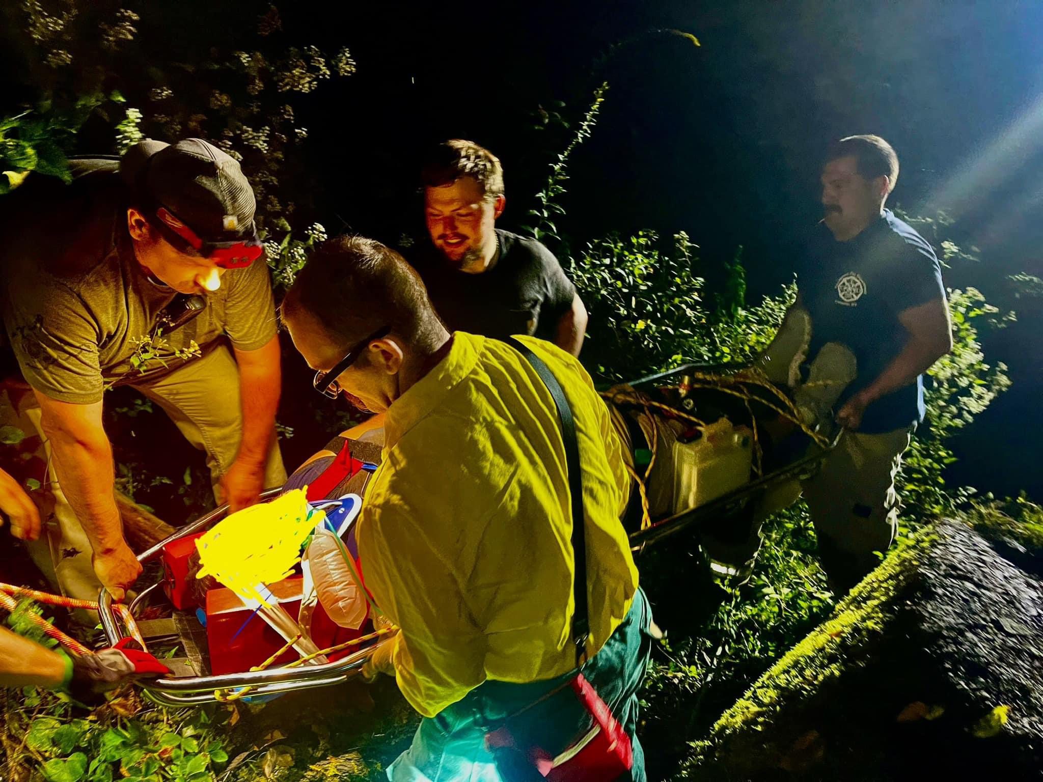 Equipped with chainsaws, portable extrication tools, rope gear, and medical equipment, the teams quickly mobilized to reach the patient, who was trapped in a ravine with his extremity pinned under the weight of his ATV.