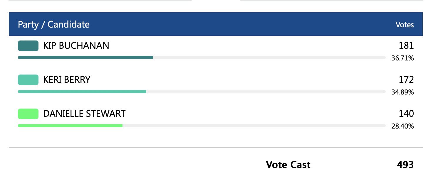 In City Council Ward 4, Kip Buchanan won against Keri Berry and Danielle Stewart.