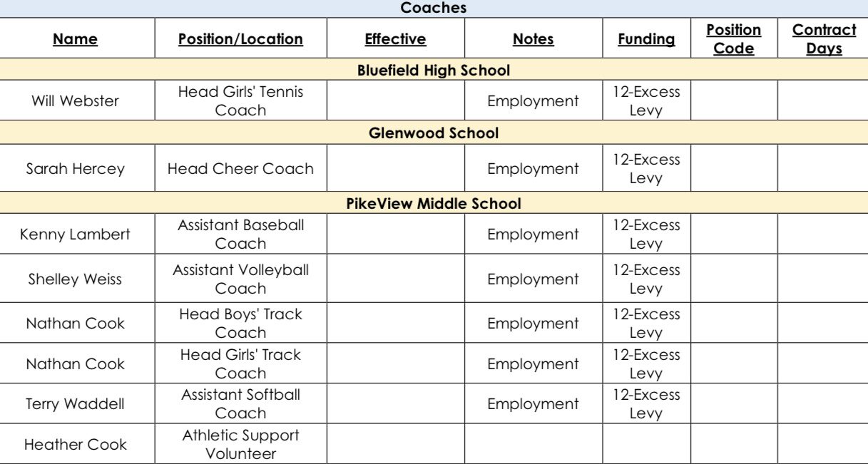 In other Mercer County athletic hiring news, the board will vote to approve the following hires: