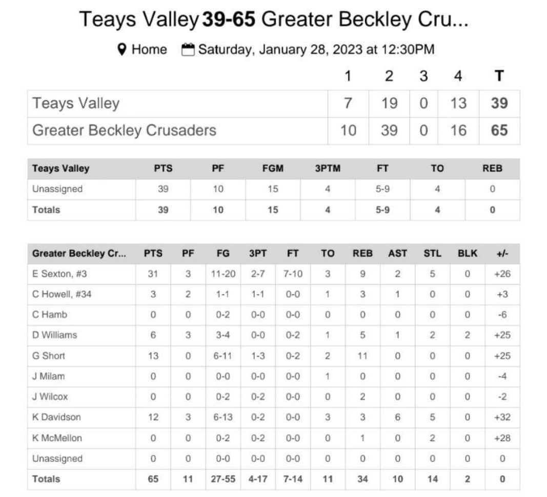 Eli Sexton poured in 31 points as Greater Beckley handed previously unbeaten Teays Valley its first loss with a 65-39 decision Saturday afternoon at Greater Beckley.