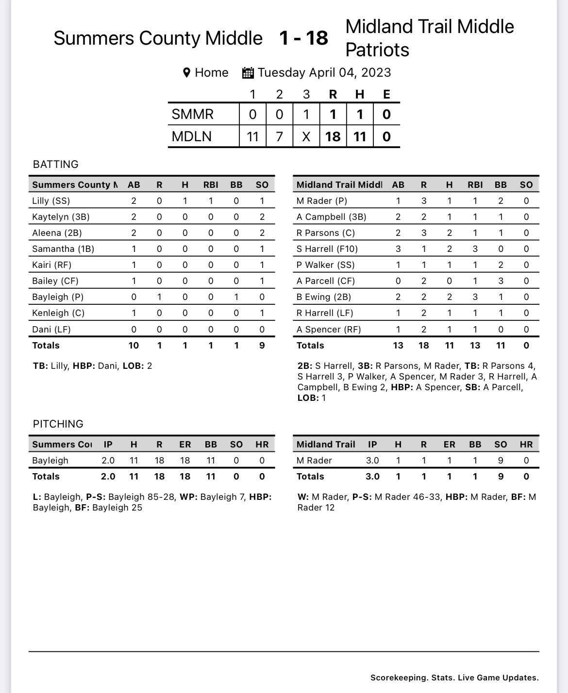 Hico – Midland Trail exploded for 11 runs in the first inning and cruised past Summers County 18-1 in a three-inning game.
