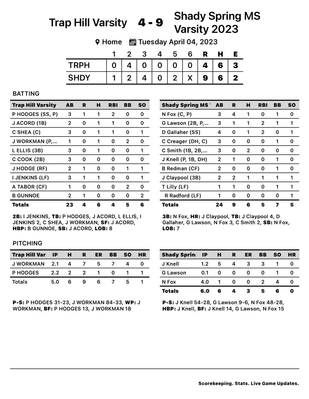 Dallas Hodges had two RBI for Trap Hill and Ian Jenkins roped a double. James Acord and Chase Shea also had an RBI.