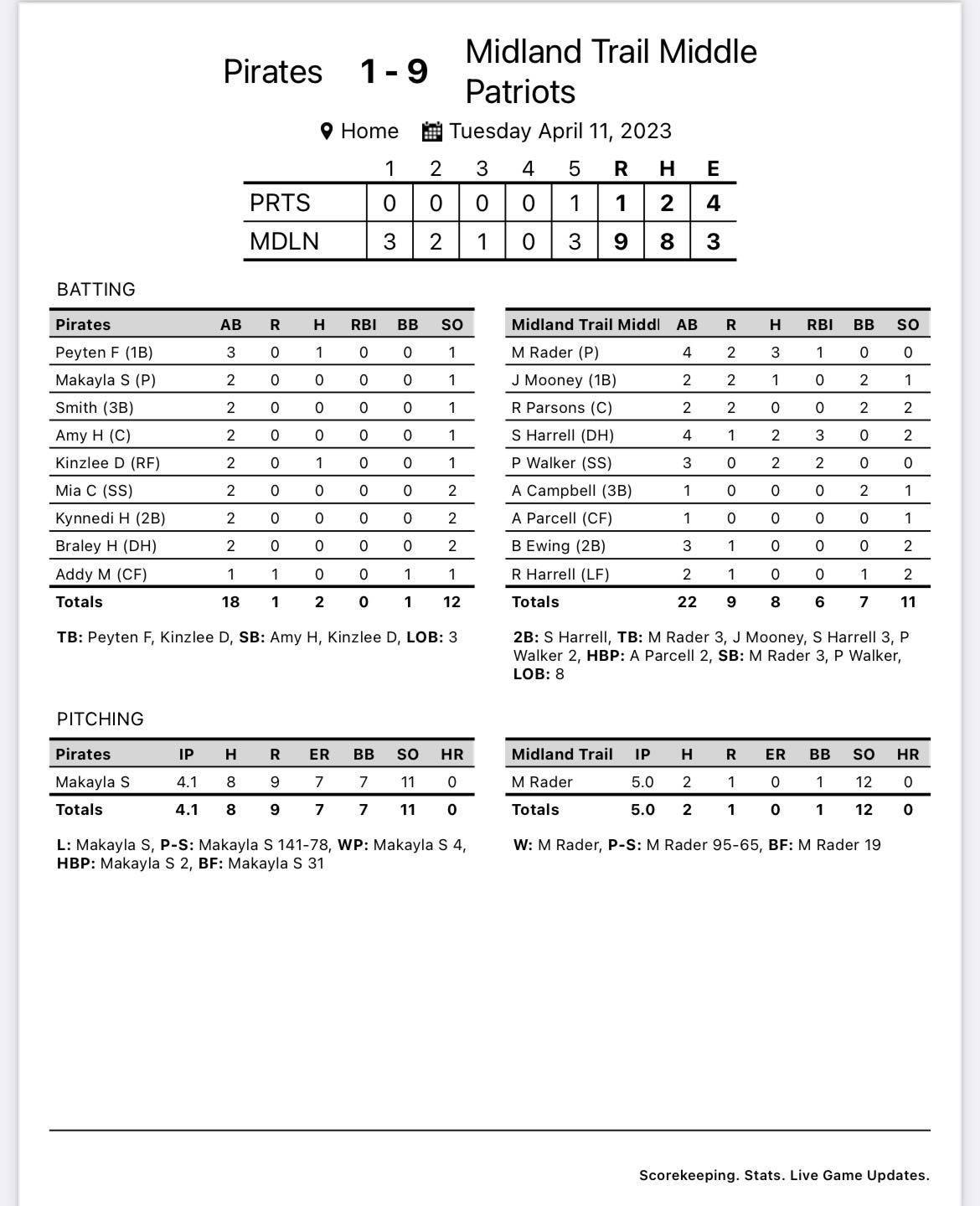 Madison Rader allowed just one hit and no earned runs while fanning 12 batters to get the win. Rader also collected three hits and an RBI for the Patriots.