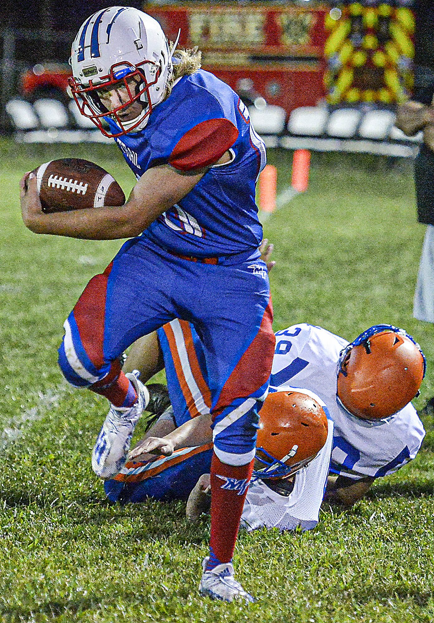 Ayden Simms was stellar for the Patriots, rushing once for 28 yards and catching two passes for 85 yards. He made the most of all three touches, turning all of them into scores. On defense he picked off two passes.