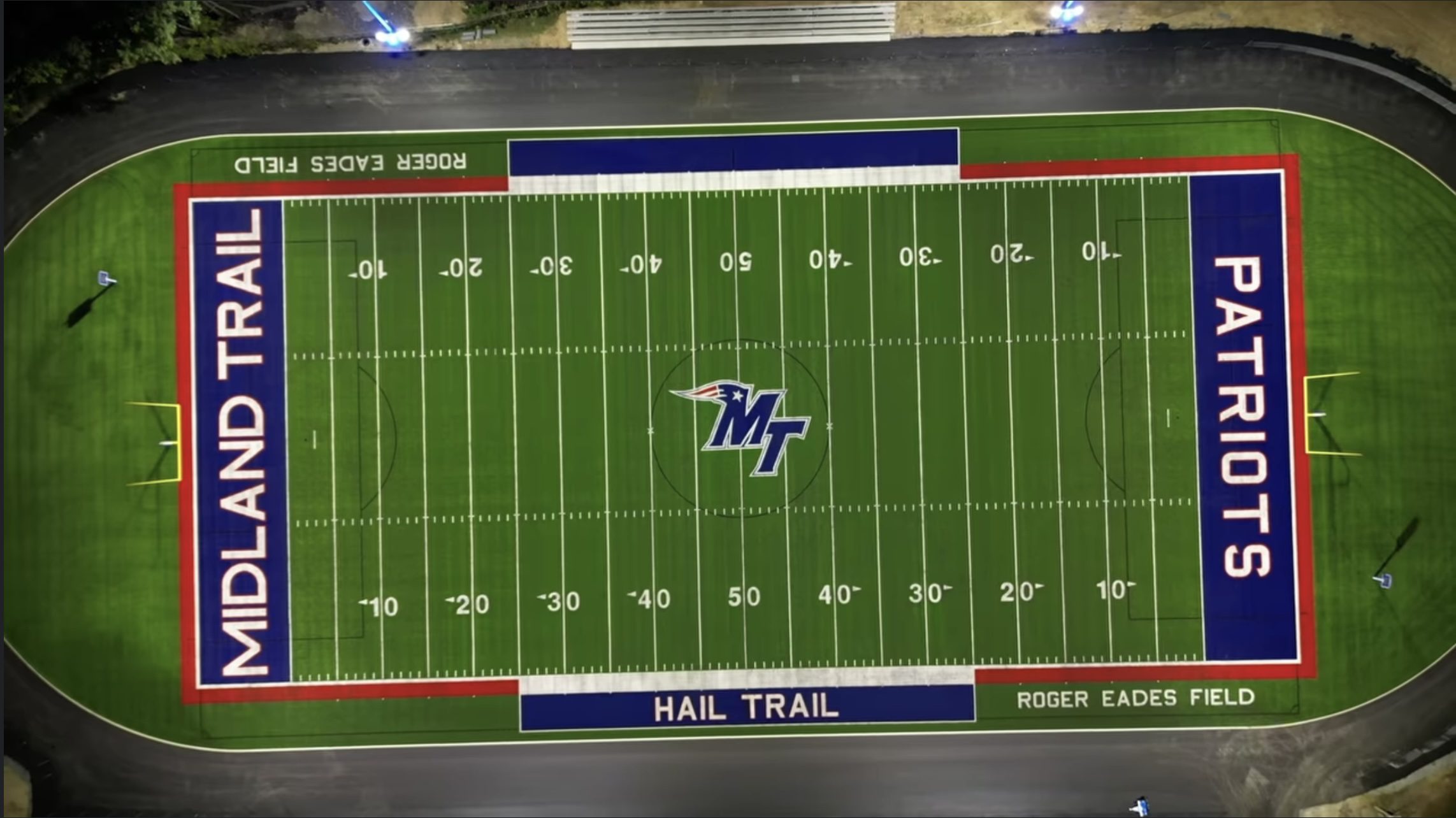 The new field proudly displays the modern Midland Trail “MT” logo at the center of the field in the school’s colors of red, white, and blue.