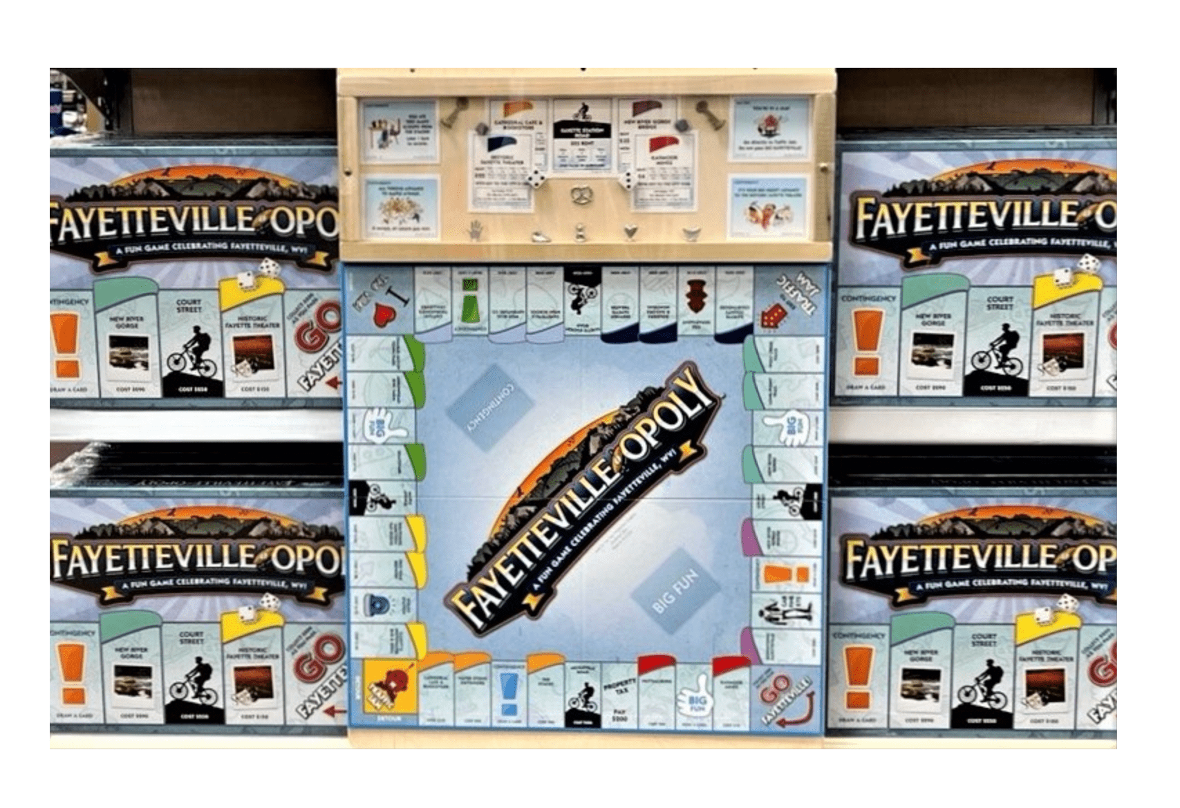 Fayettevilleopoly honors the best parts of Fayetteville, West Virginia, and features the New River Gorge, the Historic Fayette Theatre, various city streets and outdoor activities and even comes with Fayetteville-specific game pieces.