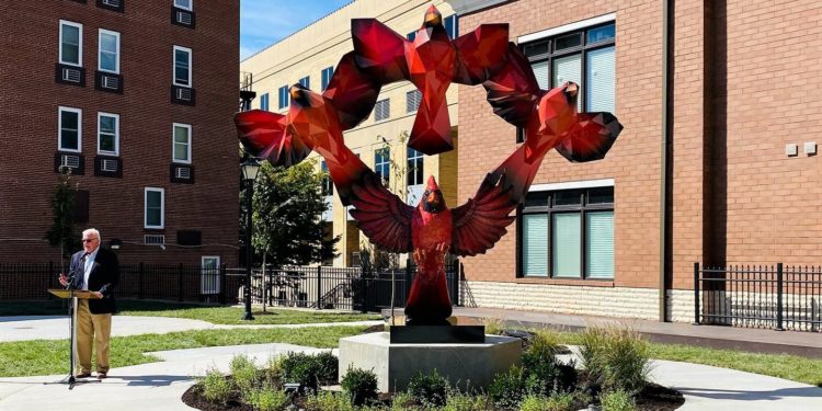 The sculpture features four cardinals, West Virginia’s state bird. The bird at the base of the diamond-shaped sculpture looks more realistic, and the birds become more abstract and refined as they reach the top.