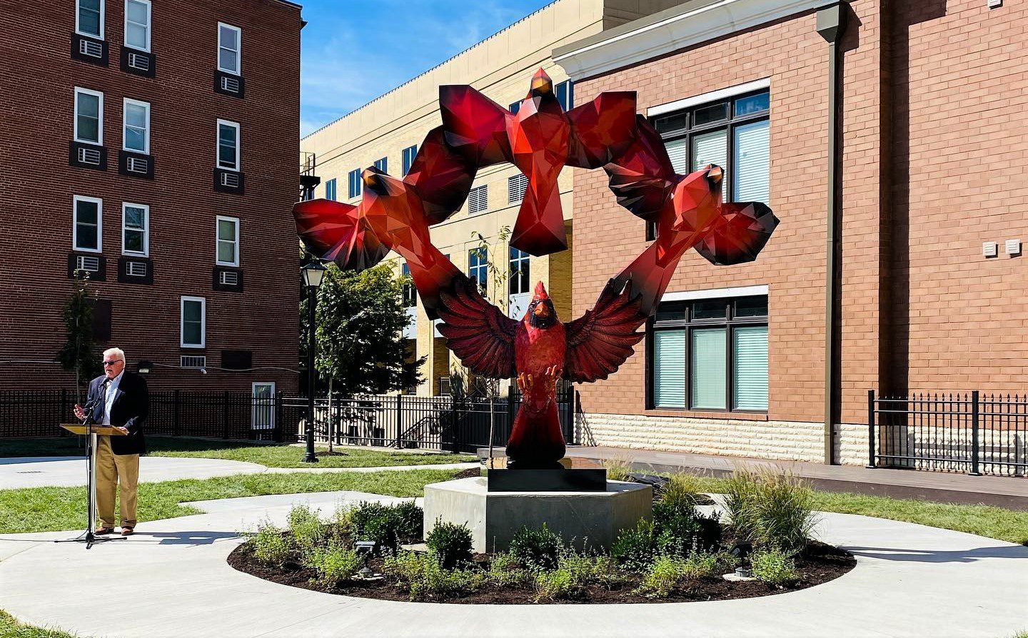 The Rising Cardinals sculpture, designed and built by sculptor Jamie Lester and engineer Jeff Edwards, sits on the corner of Neville and Herber Streets. The plaza where the sculpture rests was designed by Sam Rich of Thrasher Engineering and constructed by the City’s Public Works Department with landscaping by Green River Landscaping.