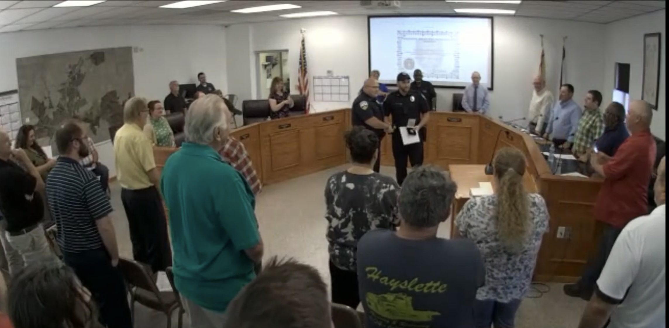 Sgt. Jones received a standing ovation from those in attendance at the meeting and was called a “hero” by Mayor Charles Briscoe.