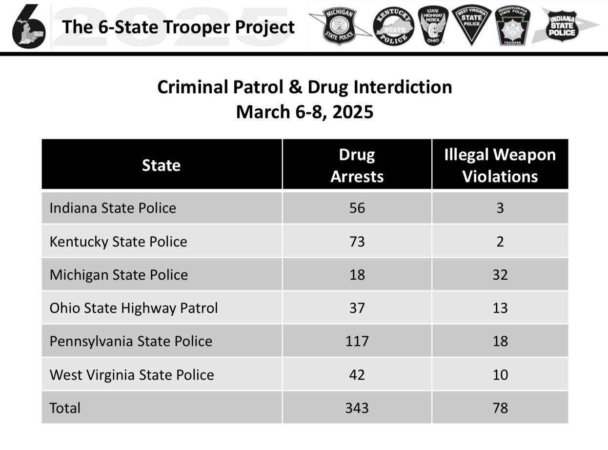 Across all participating states—Indiana, Kentucky, Michigan, Ohio, Pennsylvania, and West Virginia—a total of 343 drug arrests and 78 illegal weapons arrests were made.