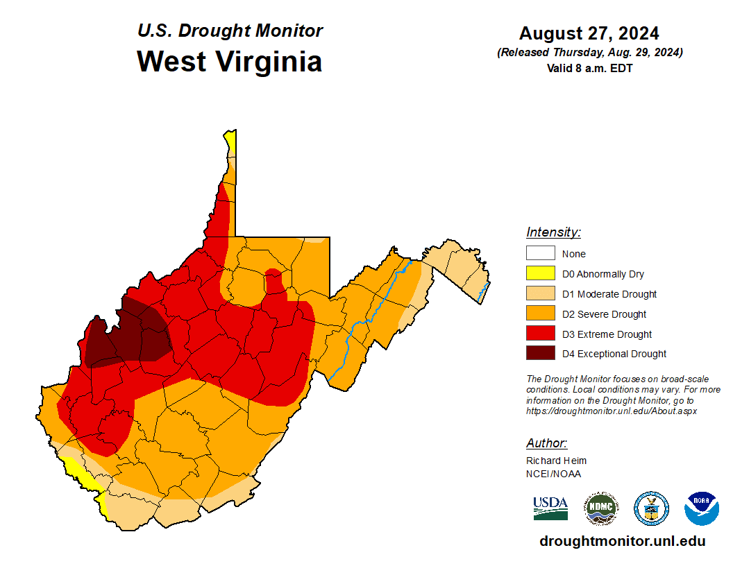 According to the U.S. Department of Agriculture (USDA), 100% of West Virginia’s topsoil and subsoil moisture was rated short or very short (dry or very dry), and 92% of the pastures and rangeland were in poor to very poor condition.