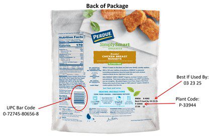 - PERDUE® SIMPLY SMART® ORGANIC Gluten Free Breaded Chicken Breast Nuggets sold in the freezer case with a “Best If Used By” date of 03/23/25. The package also bears a UPC Bar Code of 0-72745-80656-8.