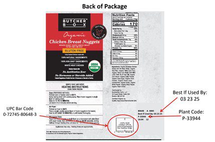 - Butcher Box Organic Free Fully Frozen-Cooked Breast Chicken Nuggets with a “Best If Use By” date of 03/23/25. The package also bears the UPC Bar Code of 0-72745-80648-3.