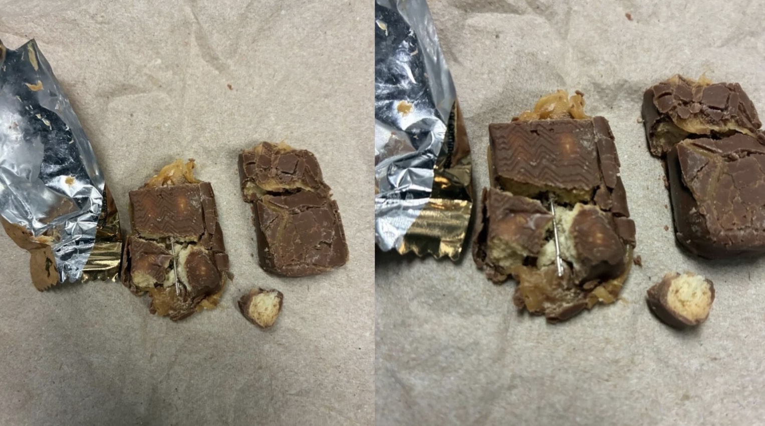 The image appears to show a piece of candy that has been tampered with and contains a needle.