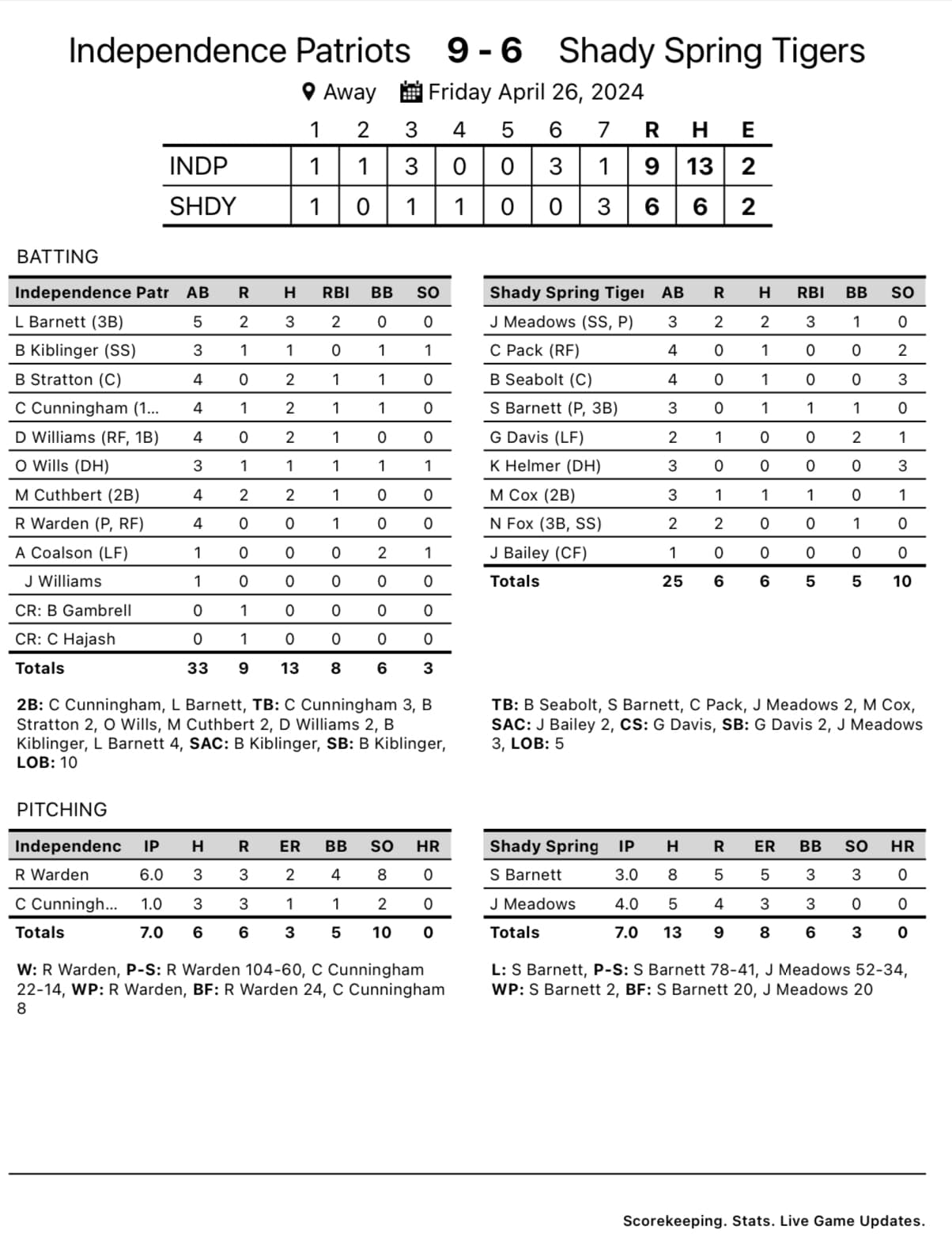 Never trailing in the contest, Independence hammered out 13 hits to even the season series with a 9-6 win.