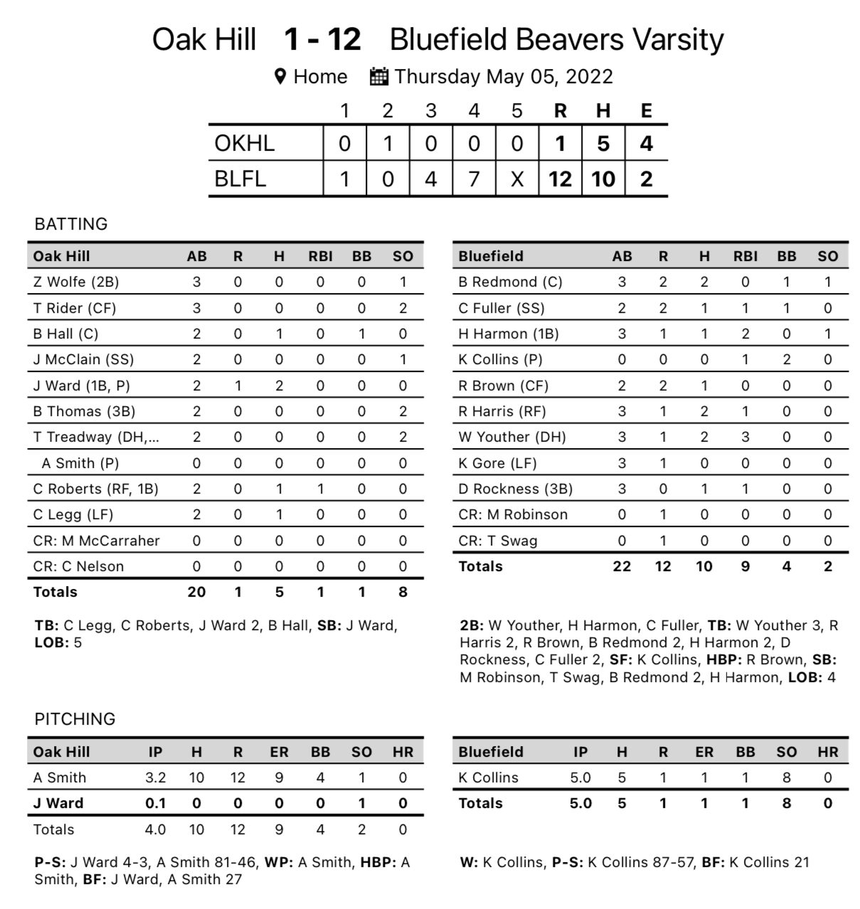 Bluefield – Bluefield scored seven runs in the fourth inning to take a convincing 12-1 win over Class AAA Oak Hill Thursday in Bluefield.