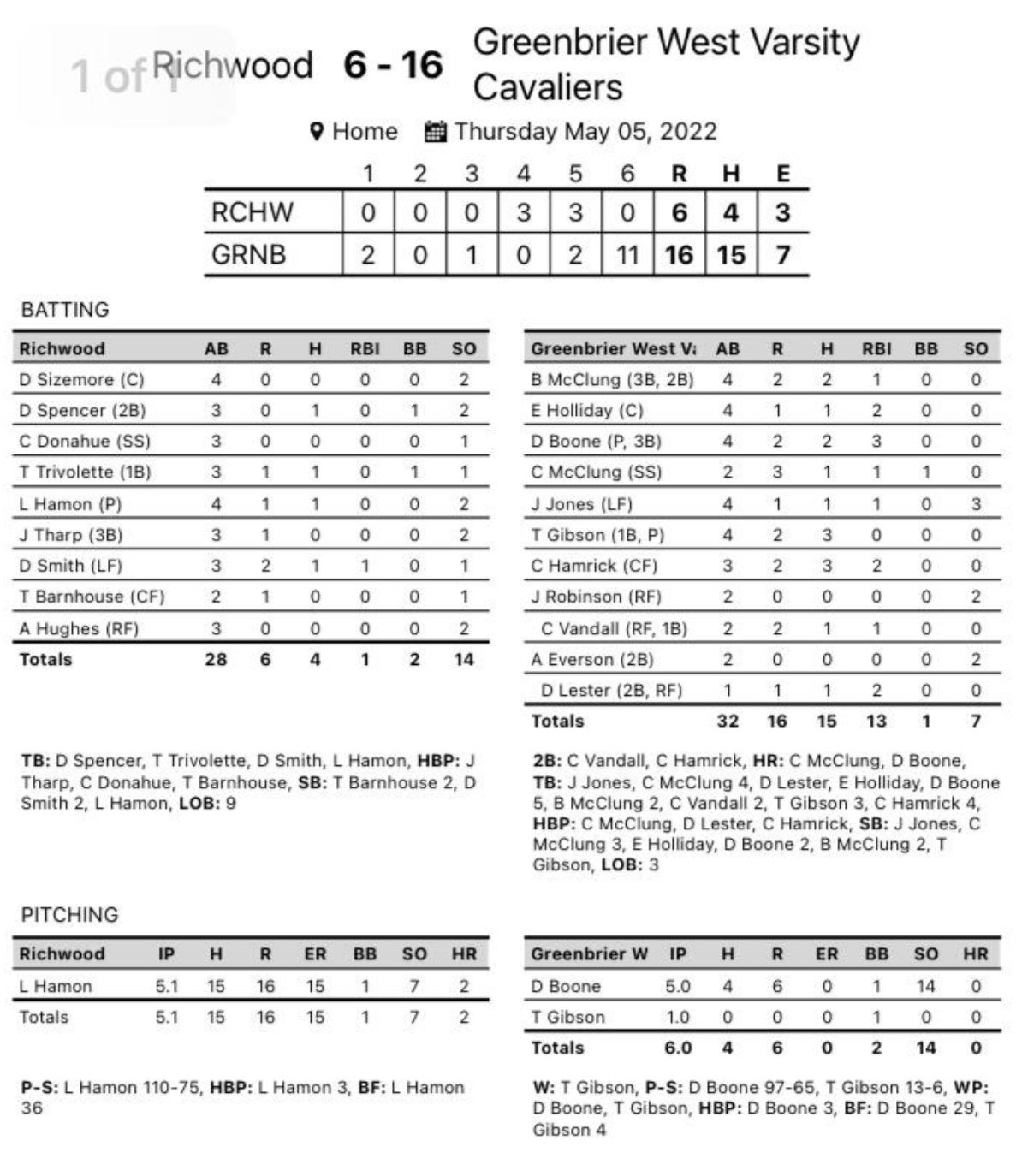 Charmco – Greenbrier West notched 15 hits, scoring 16 runs in a 16-6 win over Richwood Thursday in Charmco –