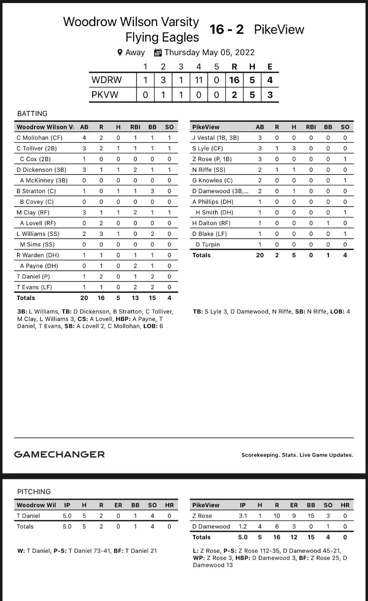 Woodrow Wilson 16, PikeView 2 (5 innings)