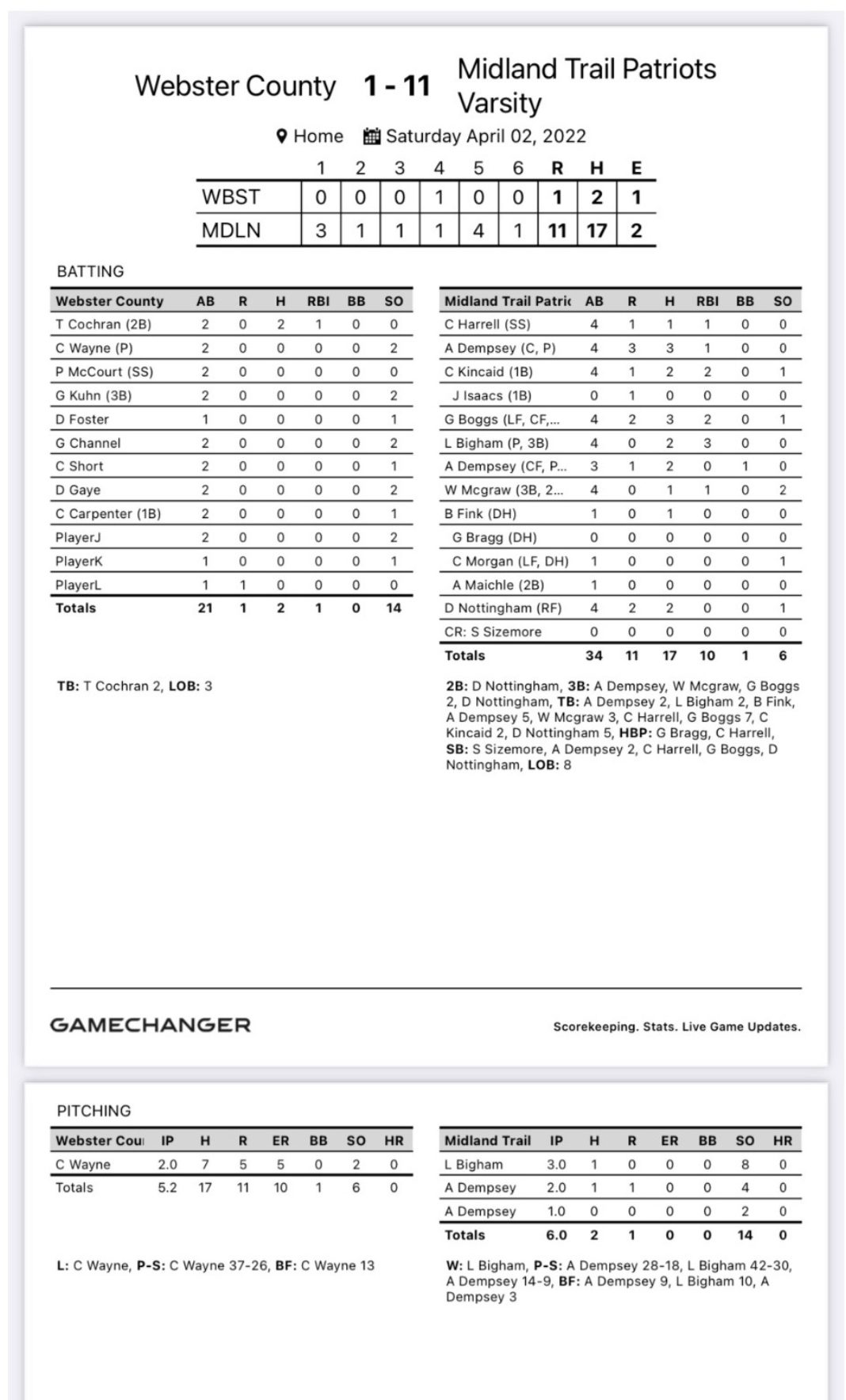 Griffin Boggs led the way for the Patriots with three hits, driving in two runs while Larry Bigham drove in three runs on two hits.