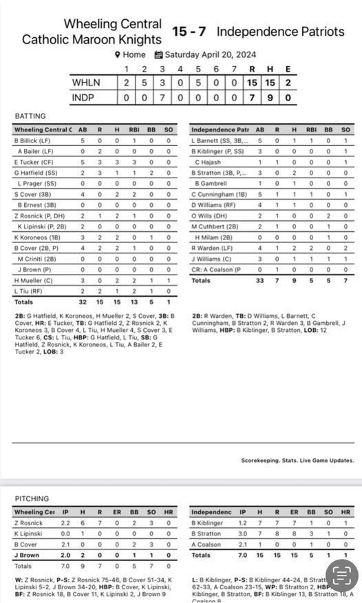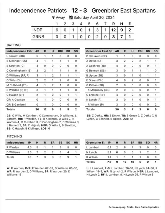 Warden had a double and two RBI against the Maroon Knights who had 15 hits in the win. Blake Stratton had two hits for the Patriots.