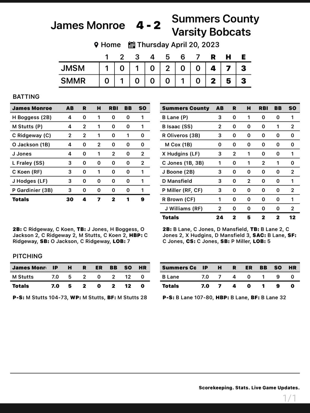Own Jackson had a pair of hits for James Monroe with Cooper Ridgeway and Carson Koen each hitting a double.