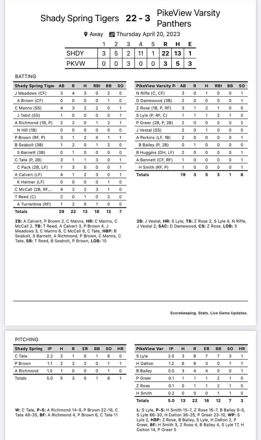 Shady Spring 22, PikeView 3 (5 innings)